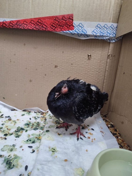 Здравствуйте, форумчане! На этот раз срочно, !СРОЧНО! требуется помощь голубю, подобранному с улицы с гнойной шишкой на глазу, переросшую в гнойник под глазом, который сильно мешает жить пернатому. Но обо всем по порядку. Вводные: взрослый голубь не известно кого пола, с гнойной шишкой на одном глазу был подобран 30 декабря. После подбора гнойная шишка была намазана тетрациклиновой мазью, после чего благополучно отвалилась через два часа. Глаз пострадал как будто, вместе с шишкой отвалился, но доброхотом, его подобравшим, было принято решение мазать то, что было глазом дальше тетрациклиновой мазью во избежание дальнейшего заражения. Также голубю стали давать юнидокс Солютаб, разводя водой в указанных ранее на этом форуме в похожей теме пропорциях, и давался Нистатин. Более ничего не давалось, кроме еды в виде корма из зерновых(надо уточнить, сам не знаю). ОДНАКО, неделю назад место под глазом, где была шишка, начало разбухать и как будто наполняться гноем, и вот сегодняшний результат на втором фото (на первом фото результат как только шишка отвалилась). Ко всему прочему, вчера давая таблетку юнидокса, птица поперхнулась, и долго отчихивалась, но сегодня появились посвистывания при дыхании и кашель, что похоже на асперационную пневмонию, не знаю, есть ли она у голубей. Что делать сейчас с ним??? @маленький принц подскажите пожалуйста, придите в тему на помощь