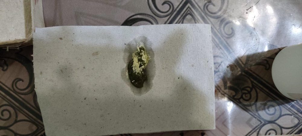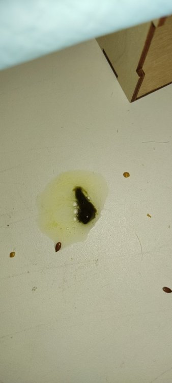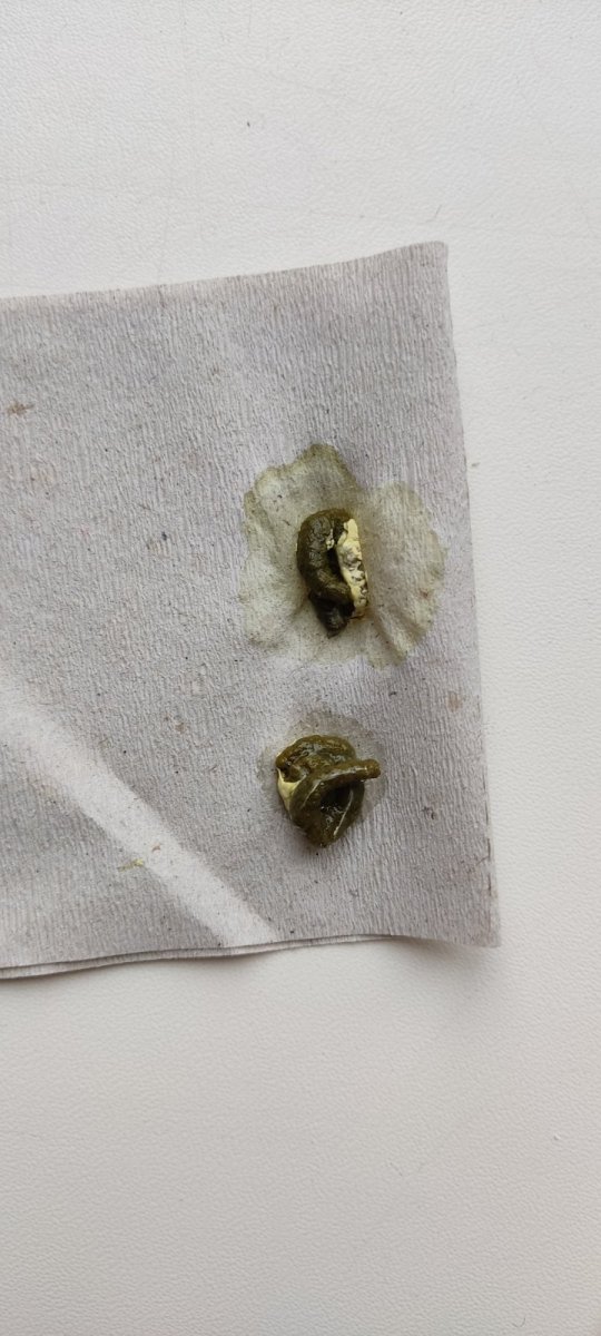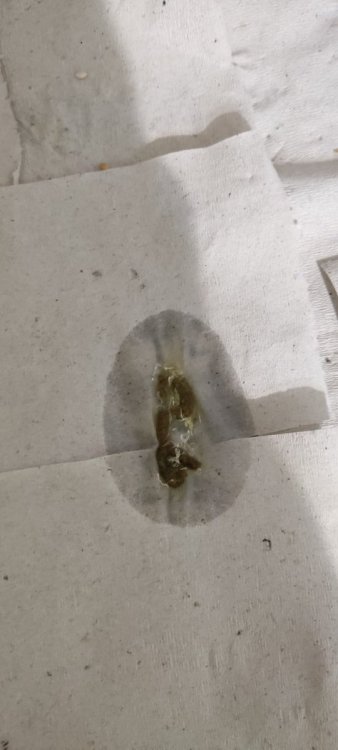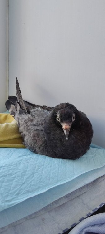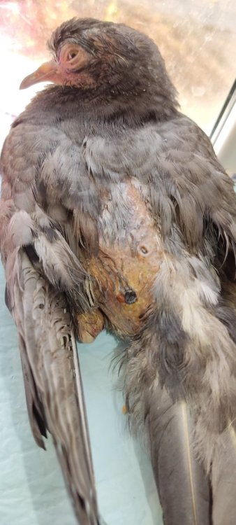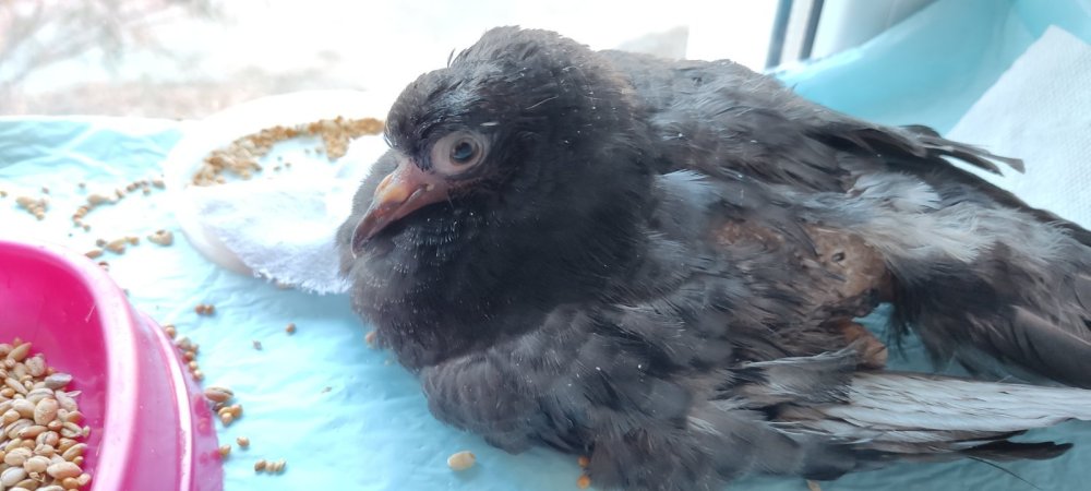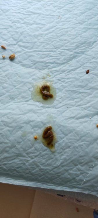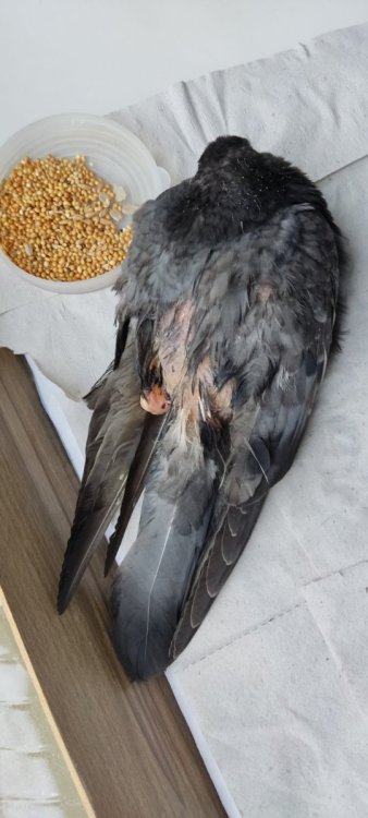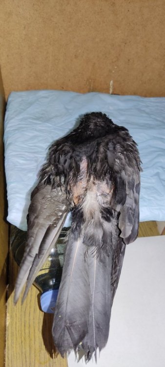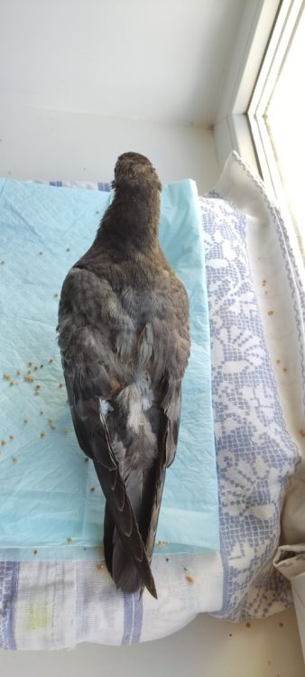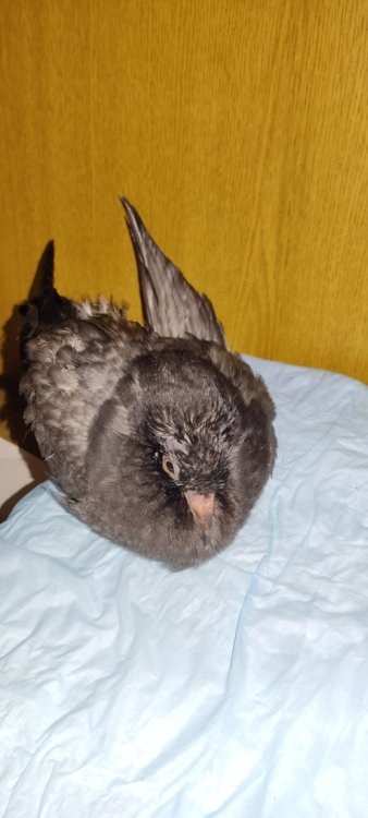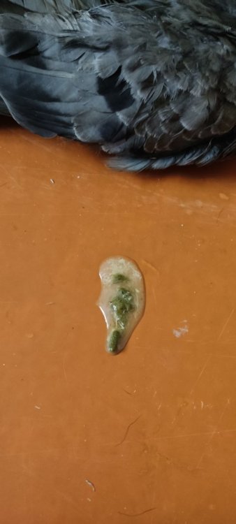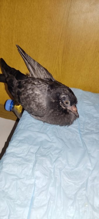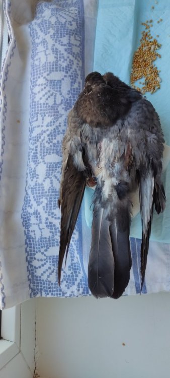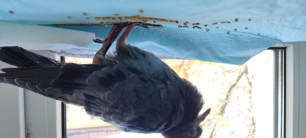 3. В общем 10 Октября 2025 года я подобрал голубёнка, хоть он и умел летать но от меня почему то не стал улетать. Он хромает на одну лапку, на этой лапке типо как гематома, так же у него выдраны перья сзади и были раны как будто от когтей (раны уже зажили) и запекшаяся кровь. Голубёнок изначально сам ел и пил, но был довольно истощён. Помёт был более менее нормальный на вид (ну как для меня, как человека который ничего не знает о ветеренарии и птицах) см. фото. На следующий день мы отправились к ветеринару. Доктор осмотрел его, крылья целые, раны не столь критичные, лапка как будто была укушена (см. фото) док сказал ничего с лапкой не делать и просто наблюдать. У меня есть Энрофлон 10%, сказал я доку, и спросил может ему какие нибудь антибиотики дать? Доктор сказал: мазать раны Левомеколем, и давать Энрофлон разведенный 0.1 мл на 100 мл воды. На следующий день я вижу что у голубёнка помутнился глаз и какая то слизь выделяется. Я снова поехал к доку, было сказано мазать тетрациклиновой глазной мазью. Мазал ему несколько дней, но эффект был слабый, так как голубёнок часто чешется и чиститься и вытерает мазь с глаза + у него какая то перхоть. В общем сейчас этот глаз неплохо выглядит но вокруг глаза чуть припухшие ткани. 13 Октября я его купал, больно он уж грязный и скользкий был. Перед тем как купать его я специально прогрел комнату кондиционером так что в комнате было градусов 30 + само место куда я его положил было теплое и сухое. И он уснул в теплом полотенце, и спал долго. 17 Октября мы были снова у дока, он сказал что все чётко раны зажили, и мы пропили 6 дней Энрофлон. Но у голубёнка уже были сопли (желтые в ноздрях), иногда жует какие то сопли в клюве и иногда очень широко может открыть клюв как буто бы подавился чем то (я так понимаю он задыхается из за соплей) либо же приоткрывает клюв видисо чтобы вдохнуть воздух. он чихае, часто чешется, взъерошивал перья, нахохливался и мог долго стоять на одной лапе + помет сильно испортился, стал сильно жиже как сопли, а иногда могло выйди довольно много воды и маленьким кусочком помета; сейчас же помет болотно зеленый, склизкий, иногда также может много выходить воды с пометом. И да голубенок много пьет воды. Я ему даю из еды: просо, пшеница (также есть проросшая), лньяное семя - все купленное на рынке. Разок давал ему яблоко и варёное яйцо (белок) - охотно ел. Морковь не получается у него есть, видать надо на тёрке тереть. Сегодня приобрел для него Корм для волнистых попугаев Happy Jungle; в составе: -Просо красное, просо желтое, овсяная крупа, сорго белое, канареечное семя, лен, ракушка для птиц, конопляное семя, абрикос сушеный, ананас сушеный, мед. и Корм для канареек HAPPY JUNGLE; состав: -лен; ракушка; абрикос сушеный; крупа овсяная; просо; ананас сушеный; канареечное семя и ещё Минеральная смесь для пищеварения, RIO: -Морской камень и раковины устриц Белый камень Красный камень Кембрийская глина; Скорлупа кедрового ореха Древесный уголь. Семечки подсолнуха у него не получается есть как и другие более крупные зёрна типо перловки и пшеницы ( раз через раз получается съесть у него). Так что в основном он ест просо и прочие более мелкие зерна. Что сейчас происходит: Голубёнок стал более активный, если я пытаюсь его взять он либо убегает (на двух лапках) либо если есть маневр улететь всторону - улетает. Также он может клевать меня или бить крылом, если ему