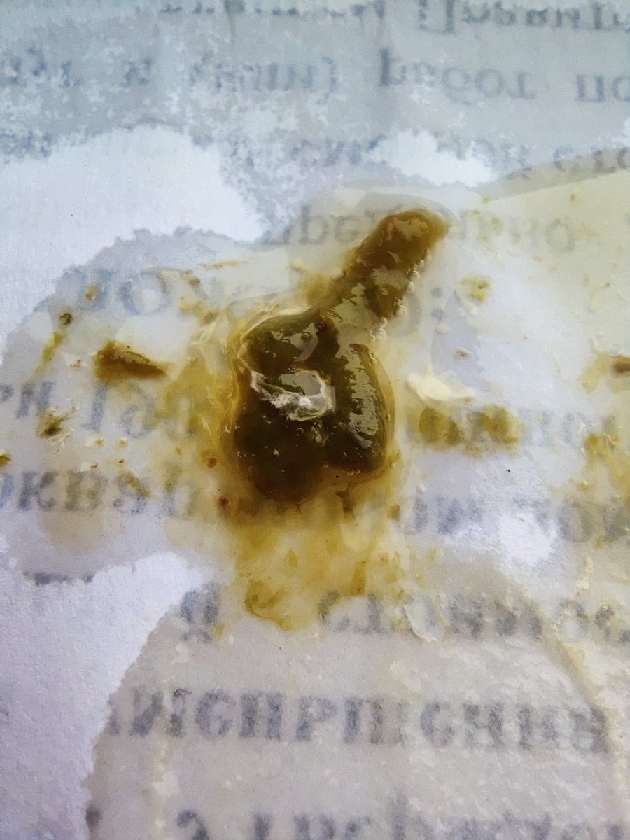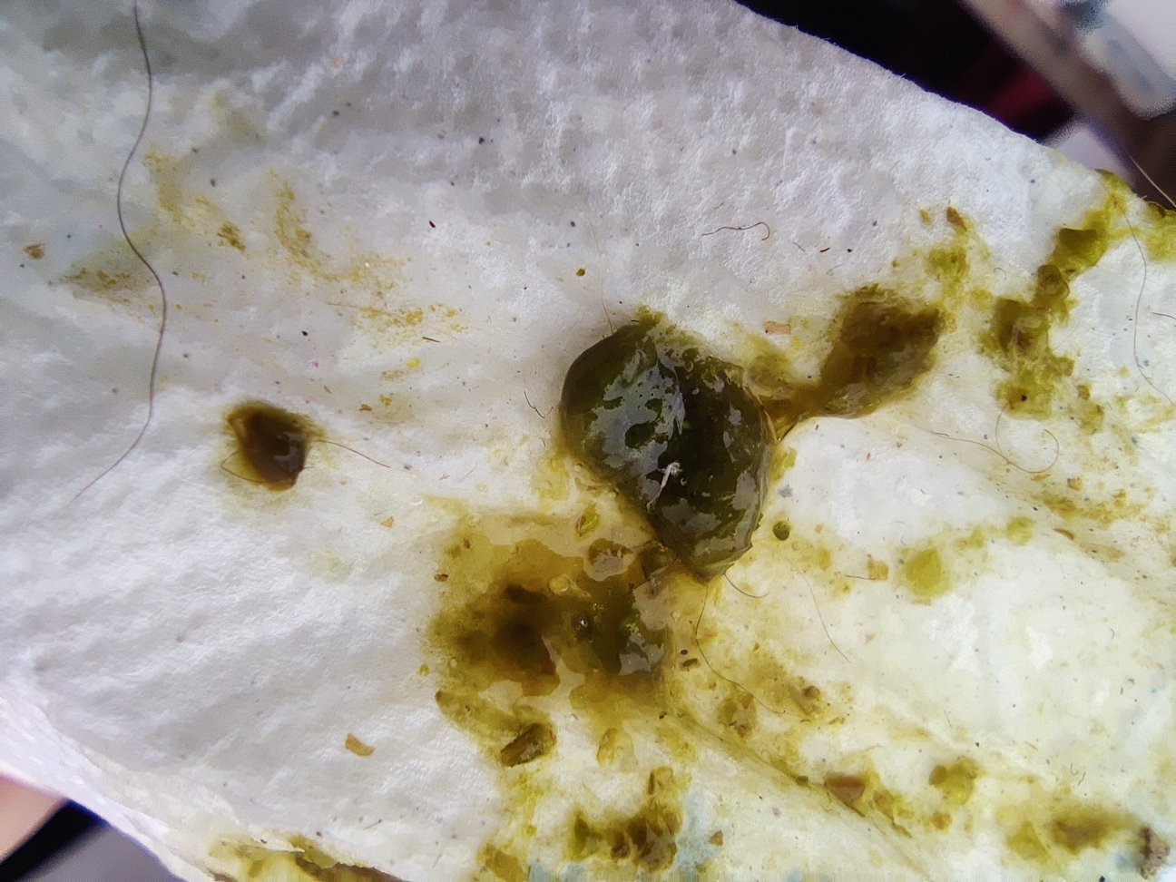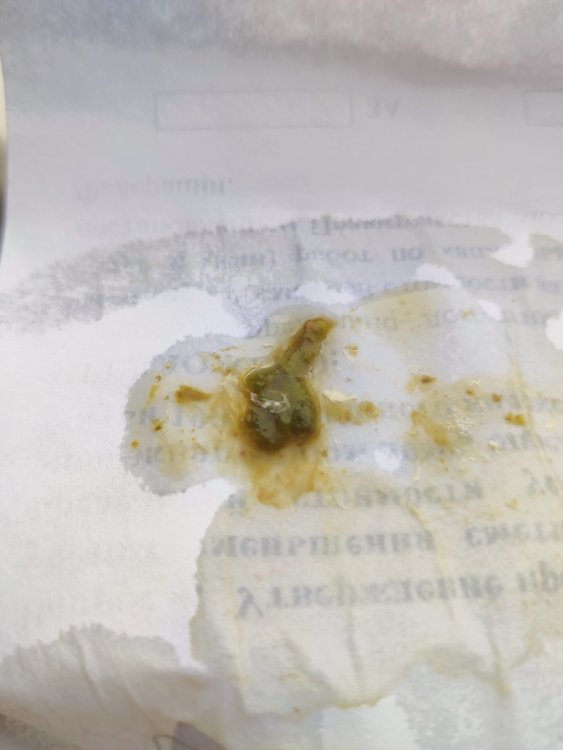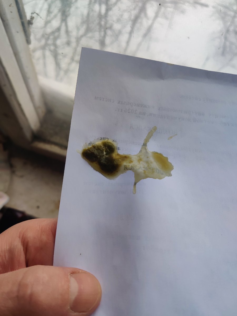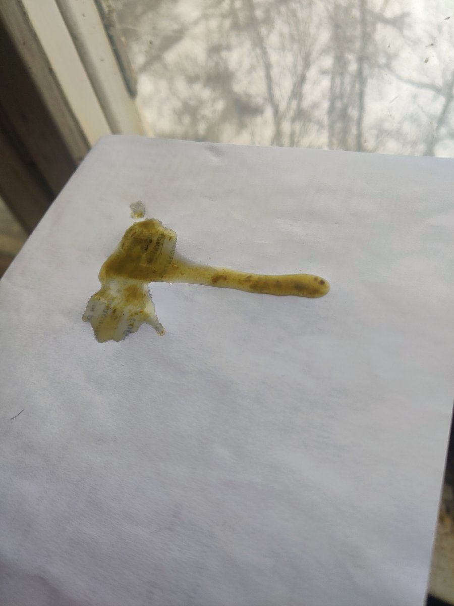 у голубя со вчерашнего дня помет стал насыщенного темно-зеленого цвета, хоть он и ест сам, но почти от всего отказывается кроме льна и семечек, поэтому начали его докармливать кашей домашней (перемолотые: горох, перловка, чечевица) сегодня утром обратила внимание, что сильно пахнет от помета (за ночь). запах кислый, похож на запах творога или кефира. каша за ночь из зоба ушла. к лечению: метронидазол (инфуз) 1.4 х 2р/д; викасол 0.1 х 1р/д и нистатин 1/4 2р/д. Добавила сегодня гепатовет 0.3мл (вечером столько же дам) будет 0.3 х 2р/д фото помета за ночь, который пахнет приложила. подскажите, пожалуйста, кандидоз развивается? нистатин не справляет? или может что-то другое развиваться на фоне приема метронидазола? Восоквицы стали светлее? Чихи по-прежнему есть, но не такие частые. Наросты в горле (в видимой части) остаются, маленькие белые, сфоткать не получается. Самый тревожный сигнал — это помет и то, что голубь ничего не ест. Когда он только прилетел, он хотел есть, просто у него не получалось. Сейчас совсем не ест. Только если положить семечку — ее тут же увидит и съест. Почему так? У него сильная боль в горле? Получается, мы уже неделю на лечении, но наросты полностью не исчезли. Просо он тоже отказывается есть. Продолжать кормить кашей? Если да, то что молоть, учитывая такой помет? Кашу начала давать только вчера -