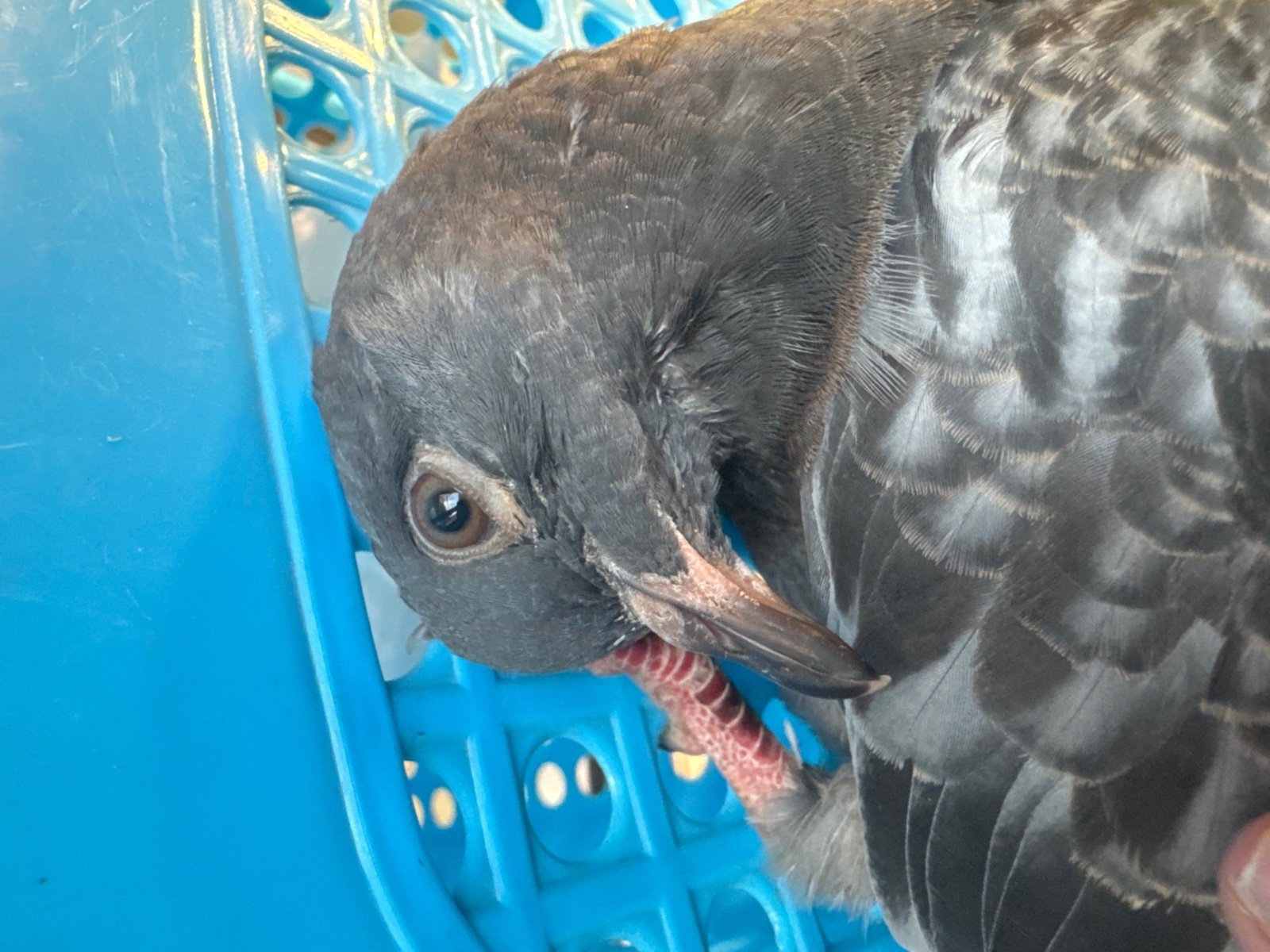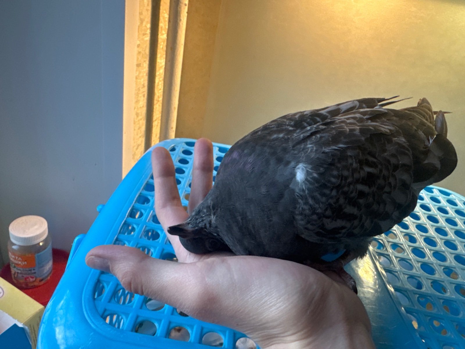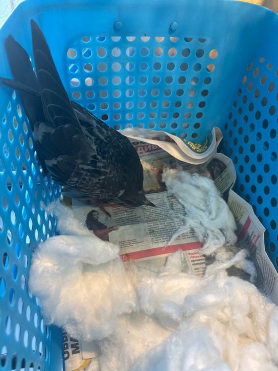 Всем доброго дня! По пути с работы наткнулись на голубя, спал-жался у тротуара в ямке. Подобрали, не сопротивлялся сильно. Сейчас находится в доме, в проветриваемой клетке с газетой и ватой с одной стороны. Никогда птиц не имели дома, не знаем почти ничего про их содержание. Вернуть обратно на улицу жалко – голубь не держит голову, поворачивает ее под себя, макушкой в пол. Не летает, теряет баланс при поднятии на руки/жердочку. Пьет, пытается есть и клевать. Поел немного кунжута и разломанного арахиса, после с удовольствием ел сваренную гречку (столовая ложка). Пил воду из соусника, потом окунался головой в него, засыпая. Помет в основном темного зеленого цвета, сначала был точно с калом, в последний раз был с прозрачной мочой и жидковатым белым чем-то. Вроде как с пероедами, но их немного. Либо это вши/блохи. Перья на месте, чистит себя часто. Лысых мест нет. Выделений из глаз/ноздрей/клюва нет, ничего не выглядит опухшим или воспаленным. Видимых травм нет. Как можно помочь этому пернатому? Будем признательны за любую помощь! Сейчас двигается в клетке, переворачивается на спину когда голова опущена. До этого спал/отдыхал.