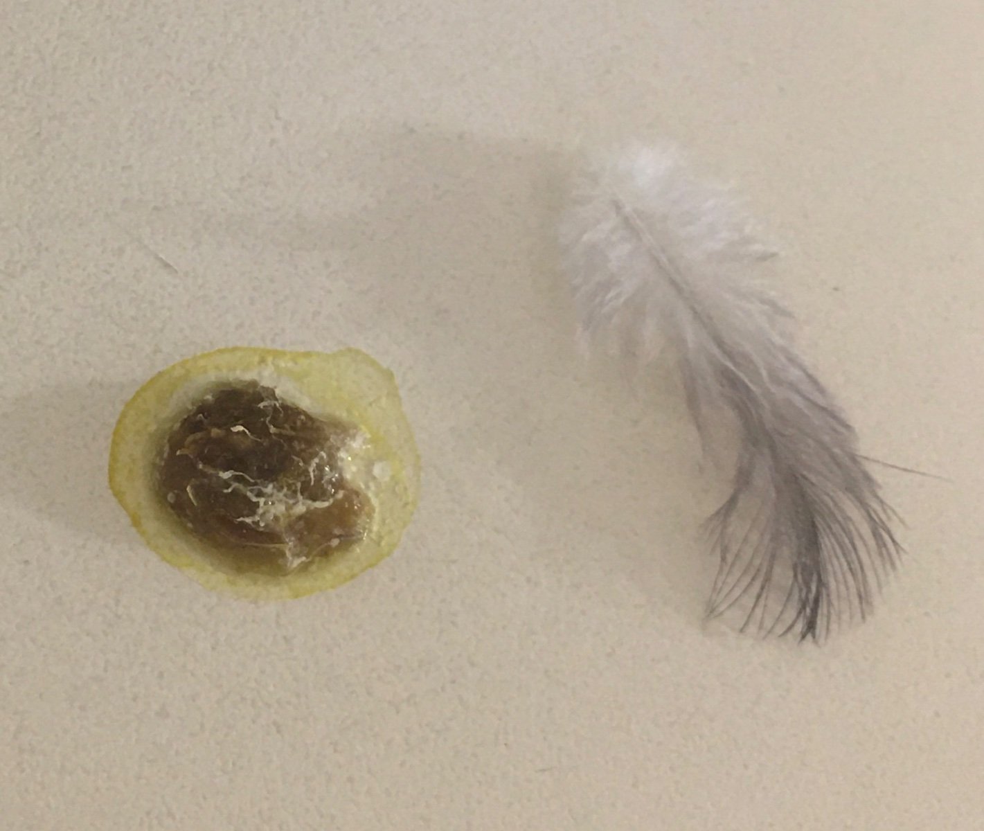 Вчера вечером Крендель съел свои 200 зёрен на ужин, наелся, ушел. А к ночи снова стал бродить, везде совать свой нос, клевать что-то. Я предложила ему зерна. Он в охотку склевал ещё 100 с небольшим зёрен. И сегодня утром выдал вес 264гр. Помёт с ночи Утром