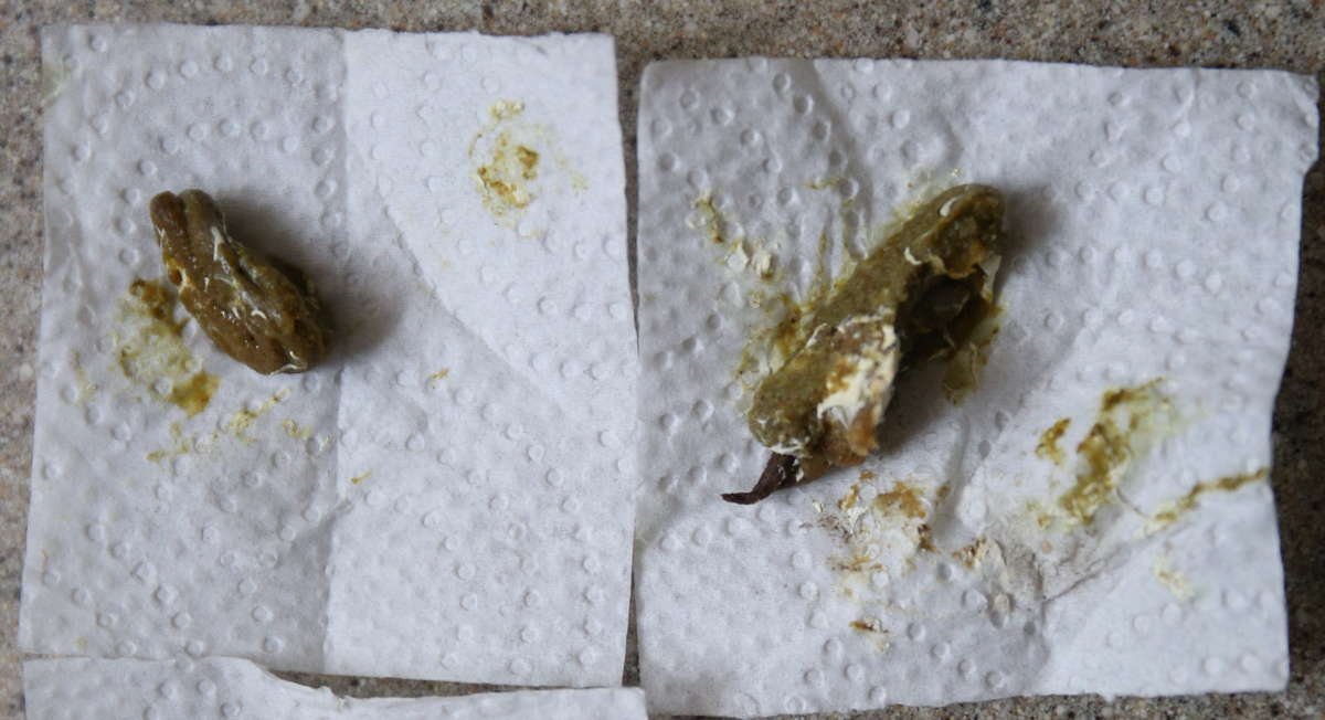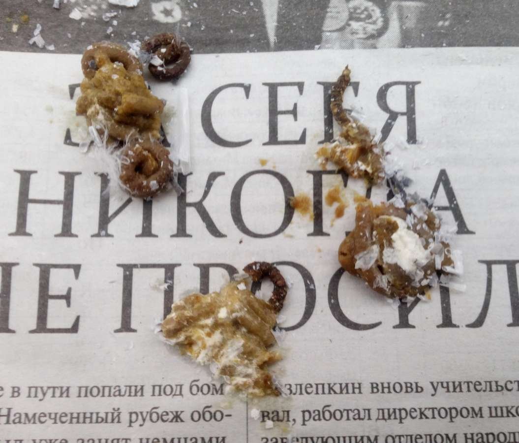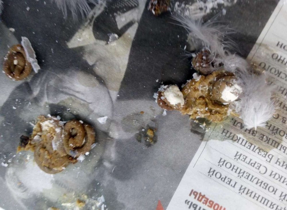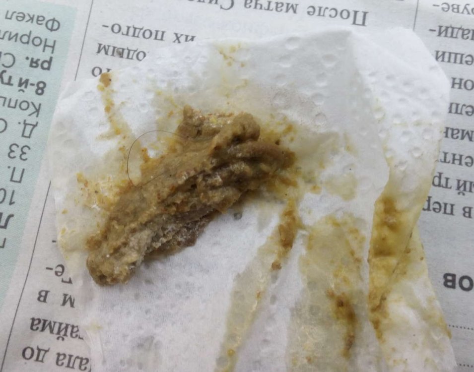 Фото за 4 дня до подрезки клюва Помет 2 дня назад Помет за сегодняшнюю ночь На последнем фото есть 2 кренделька темно коричневого цвета. Не помню что бы был такой... Обычные его помет - коричнево-болотно-зеленый. На фото немного краснит... Вот в фотошопе создала примерный цвет помета, который бывает чаще всего, который я вижу глазами. -
