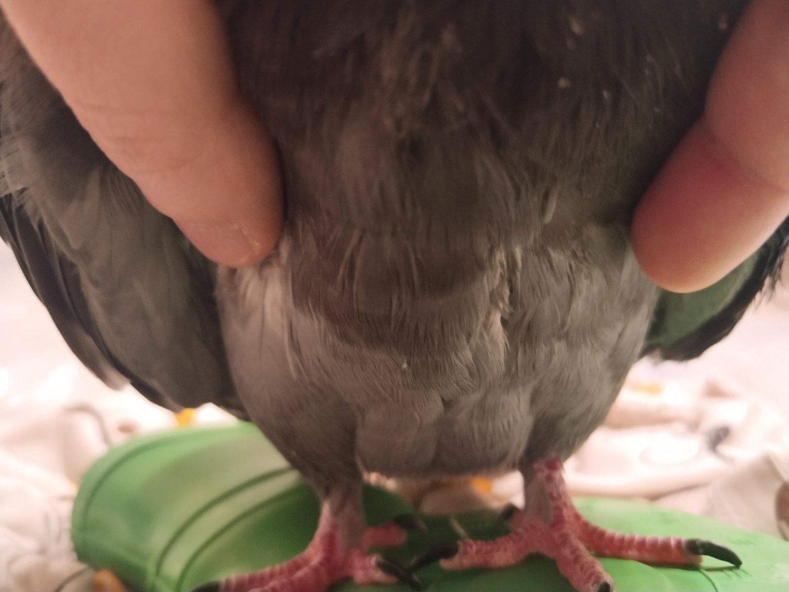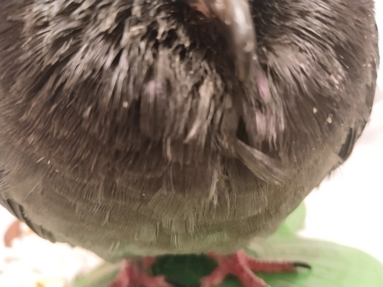 См. фото детальное выше. Там можно много что остричь. Большая часть на перьях, причем половина из них нераскрывшаяся. В приципе я могу, это звучит как менее стрессовый вариант, т.к. от воротник эти 3 часа уж очень он тяжело переносил. Очень надеюсь что сегодня он отойдет и поест, ему бы надо поесть, у него вес 210 грамм. Я не доверяю себе кормить через шприц, он сишком хрупкий и я накосячу, возможно смертельно.