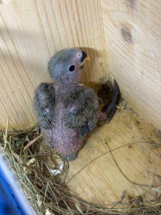 Самка неразлучник вчера начала ощипывать своего птенца (птенцу 20 дней), а сегодня у нас появились подозрения, что она его не кормит. Он целыми днями сидит в углу гнезда и пищит. Фото птенца прикрепила. Подскажите, пожалуйста, что делать?🙏 -