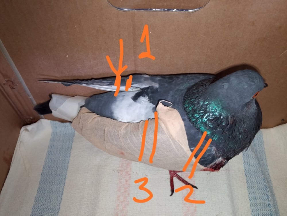 @rina-maxus Будете переделывать когда, то крыло сложите так же как здоровое, расположение крыльев и длину перьев у обоих одинаково сделайте и замотайте потуже в месте 1 (на здоровом отметила). В месте 2 тонким пластырем, если получится не перекрывая рану. Хотя это вряд ли, сейчас внимательнее рассмотрела, там живого места нет. Можно в 3 ещё закрепить, ниже всех ран. Лучше с помощником делать, в одни руки сложно. Вместо ципрофлоксацина тогда? А одного ципро недостаточно? В комплексе со смесью 1. -
