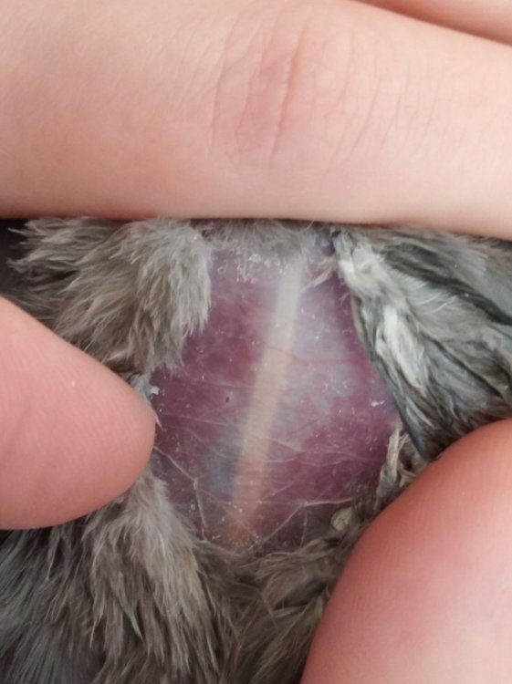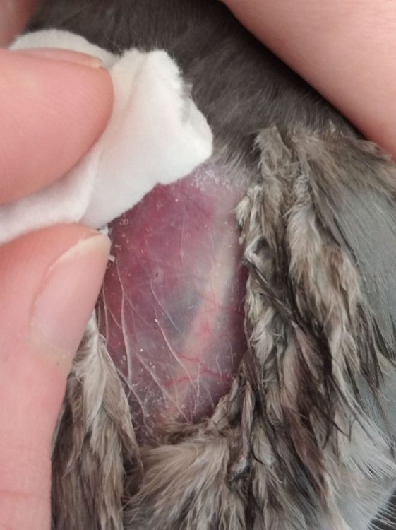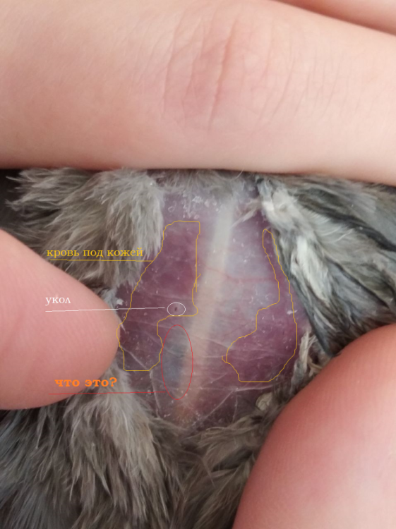 Сегодня увидели, что рядом с местом вчерашнего укола прямо впритык к килю появилось странное тёмное пятно. Сначала я подумал, что это воздух, но оно вроде бы твёрдое (но сильно не надавливал, конечно, поэтому на 100% не уверен). На фото не очень хорошо видно, вживую намного отчётливее. (на последнем фото пометил) Что это может быть? Ничего страшного? P. S. У него там после мои уколов под кожей всё такое разноцветное становится из-за крови А это каждый день колоть ещё месяца два... Страшно.