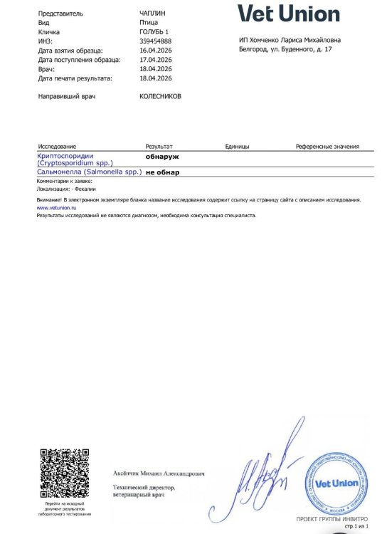 В общем получилось так, что у нас все, кто живёт в квартире получили диарею 😅 сдали анализы свои и на двух птиц (подозрение на них сразу было). Как ни странно у нас ничего из острых инфекций не нашлось, но у одной птицы (как раз этого птенца) нашлась кишечная. Теперь вопрос. Это лечится иммунитетом птицы или каким-то лекарством? Останется ли она в скрытой форме или можно вылечить совсем? И могло ли из за этого у всех вызвать острую форму диареи? Гигиену стараюсь поддерживать в клетке, сам птенец в памперсе сидит в комнате. Анализы прикладываю Ага. Увидел в анализах наших, что нет в списке криптоспоридии Надо и на это будет сдать тоже