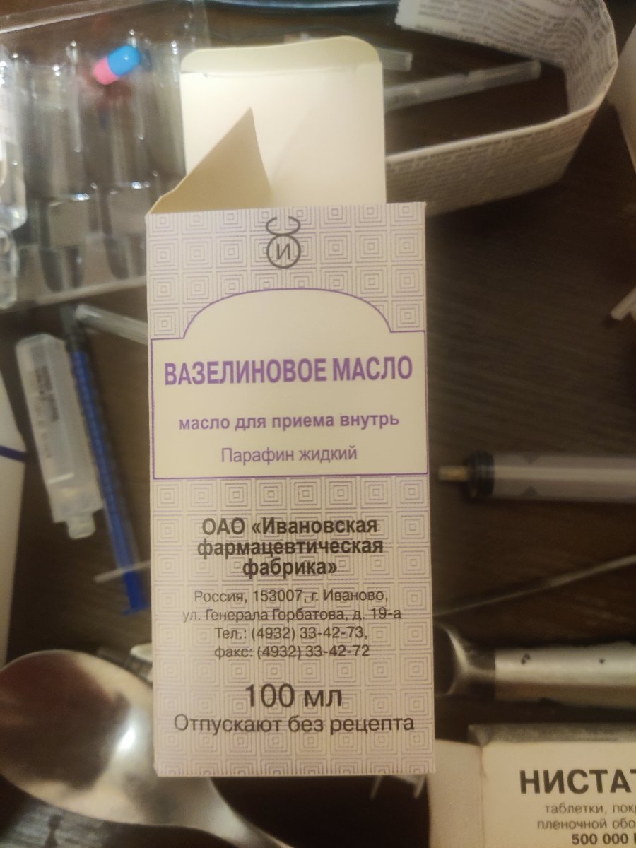 Если имеется панкреатин или мезим или креон то попробовать сначала их до вазелинового масла (возможно получится обойтись без масла если мезим/панкреатин/креон помог) Если их нет то придётся сразу масло