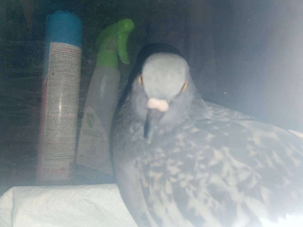 Голубь сидел на первом этаже и никуда не улетает.