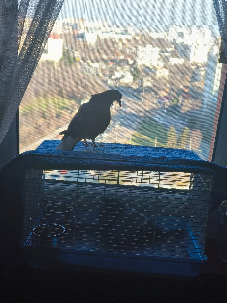 Ещё вчера вечером подрезала Ворчуну крылья... Теперь стал похож на упитанного курченка... Очень жаль! Он путался когтями в перьях и несколько раз сделал себе ранки до крови с внутренней стороны. Выхода другого не было! Всё также на меня злится, клюёт и ругается... Имя подобрано в точку.