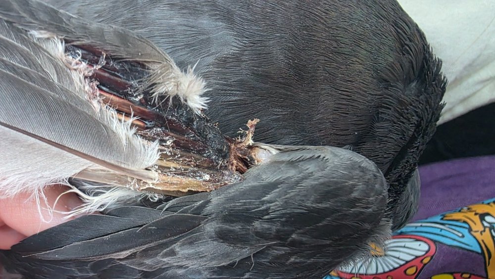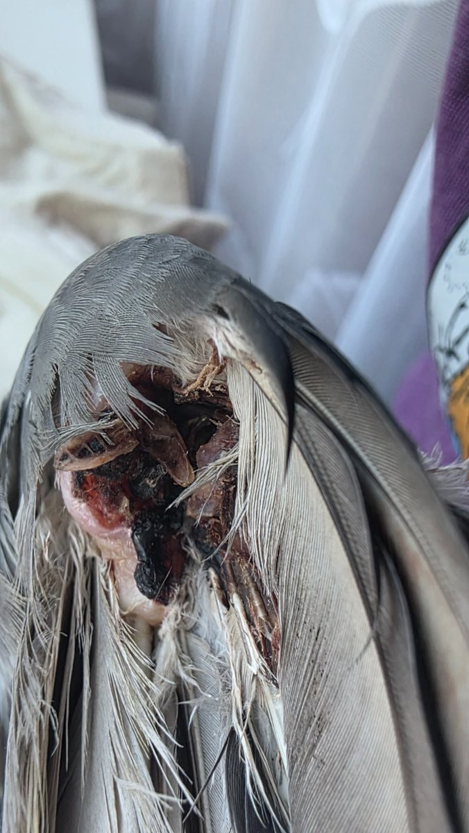 Кости с раны торчат. Мажу смесью №1, аллергии нет. Сама птица чувствует себя хорошо. Когда достаю её, чтобы намазать рану, то сопротивляется и шипит. Кушает и пьёт сама, где-то даже вырваться и убежать пытается