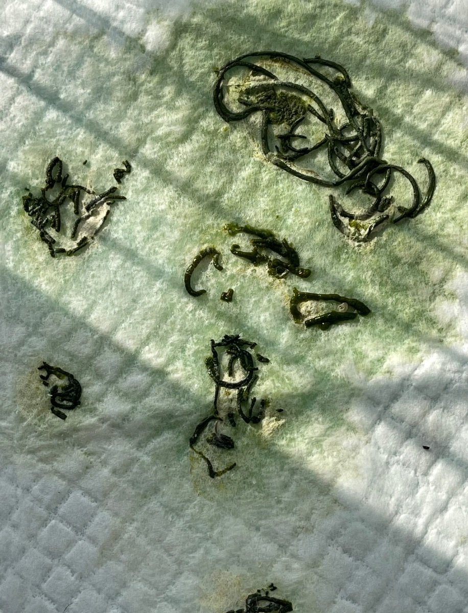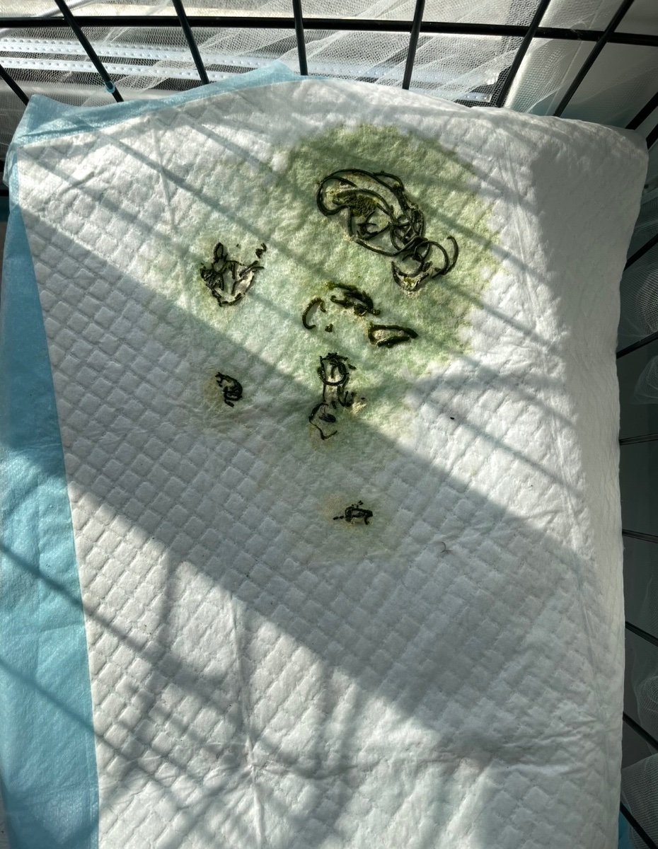 Здравствуйте! Каша 7 мл теперь уходит за 8,5-9 часов. Сегодня добавили панкреатин 25 ЕД (1/4 таблетки разводим в 1 мл воды, оттуда берем 0,45 мл — это с кашей в 2 кормления по 7 мл). Вес сейчас 315 граммов. Перерасчет на итраконазол получается по 26 пеллет 2 раза в сутки. Уколы глюкозы и рингера делаю по 7-8 мл в сутки примерно. Каша получается максимум 14 мл (жидкая) в сутки. Сегодня 6 день Ципрофлоксацина, Итраконазол в рабочей дозировке даем 2 дня Помет сегодня такой -