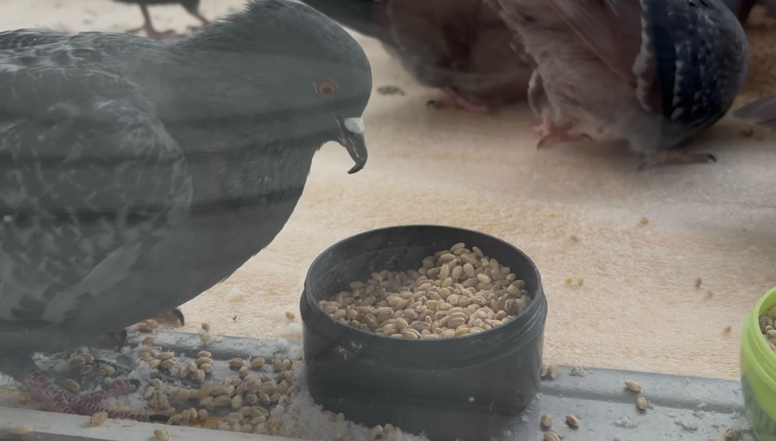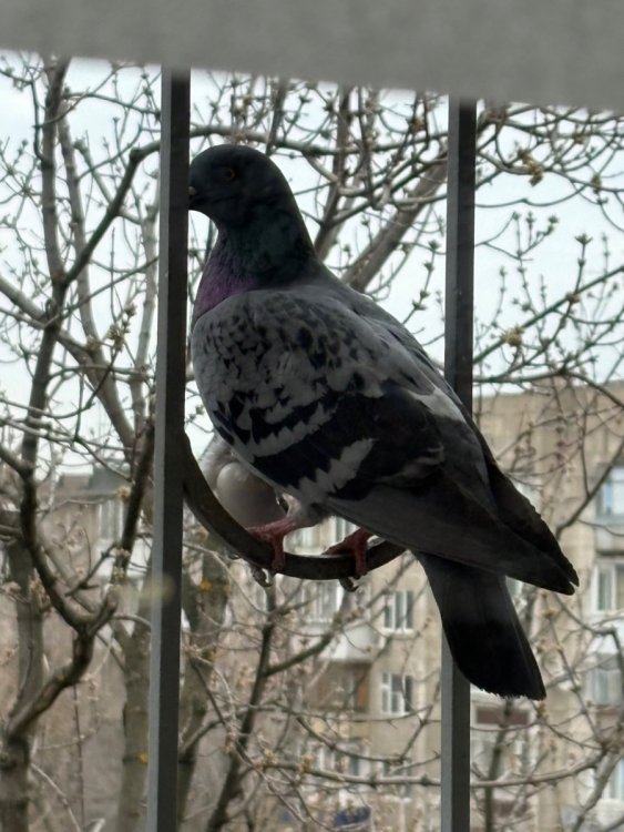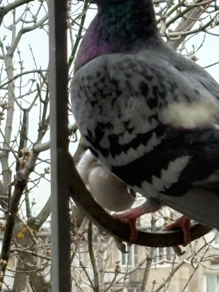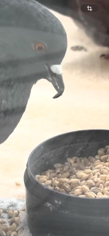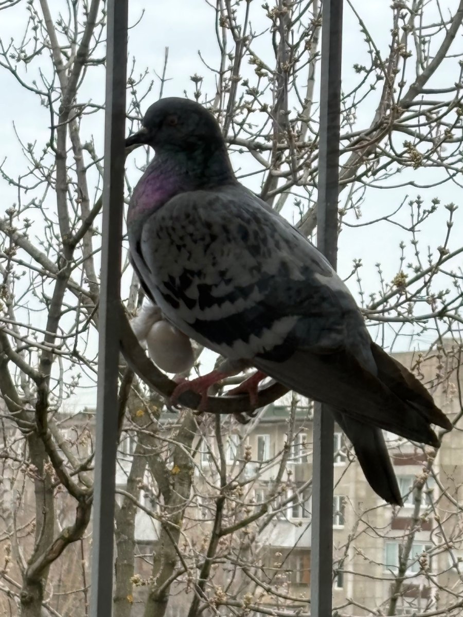 Я даже испугался сначала. Если рассмотреть, яйцо полое, поэтому и не отваливается. Вот такой кривонос, кормится на балконе с ноября только из глубокой чашки. 50 тысяч рублей стоит прокормить на балконе дворовую стаю голубей четыре зимних месяца. Перловка, пшено, витамины, чаевые курьерам и т.д. В холода в день улетало 14-16 пакетов по 0.8кг. Сейчас, когда уже плюсовые температуры, стараемся обходиться 7-8 пакетами в день.