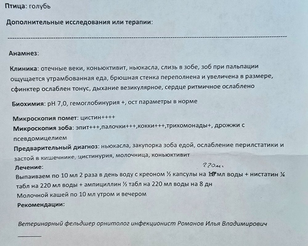 @Vera VS только не выполняйте эти назначения до ответа консультантов. Молочную кашу голубям нельзя. Дозировки неправильные. Ампициллин вообще не даётся, только с клавулановой кислотой если. По 10 мл выпаиваь, да ещё при стоячем зобе, жесть.