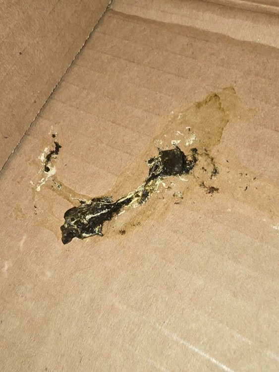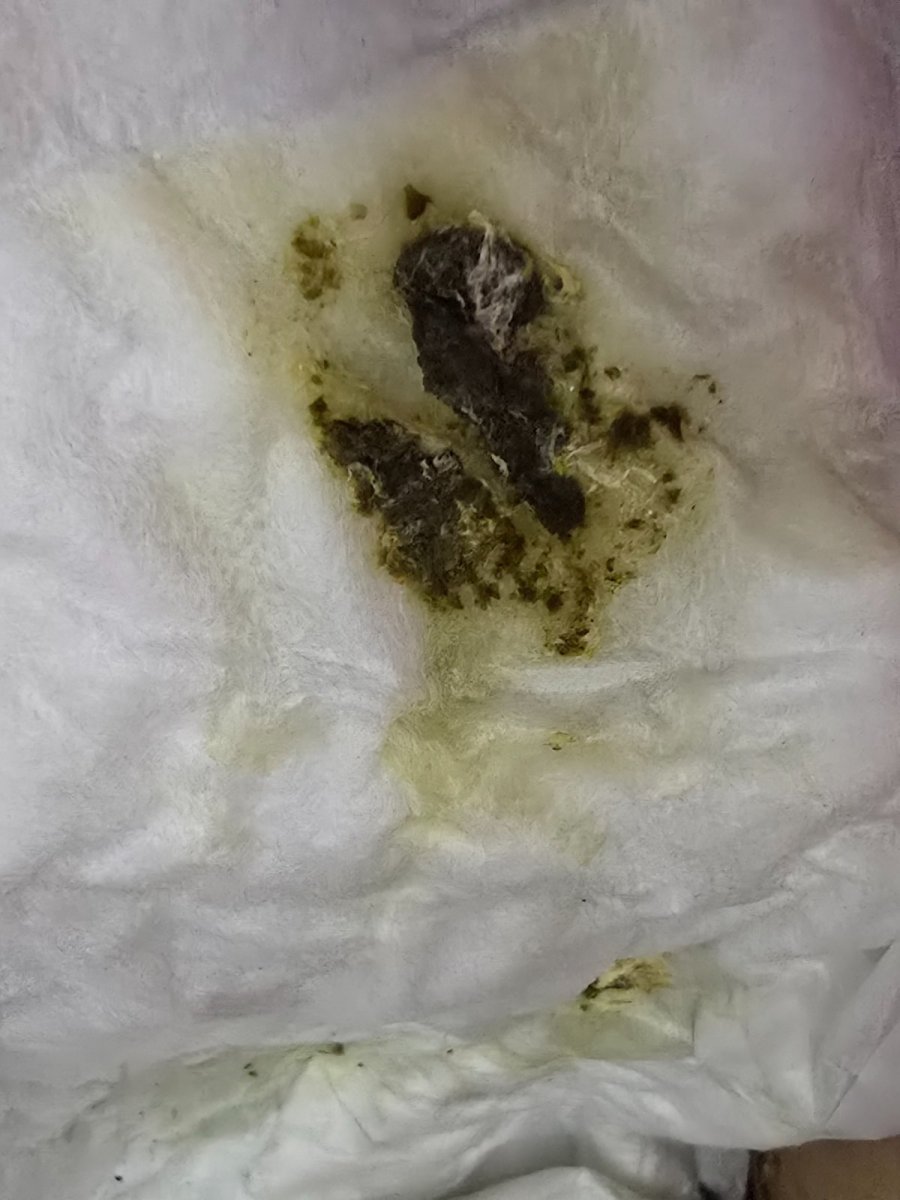 Да, наконец то почти опустил. Но ещё немного там что то есть мне кажется. Или может это просто водичка. Как пластилин больше не чувствую . Помет сегодня был вот такой. Хоть не совсем вода. Его можно покормить кашей сегодня? А то совсем один скелет остался.
