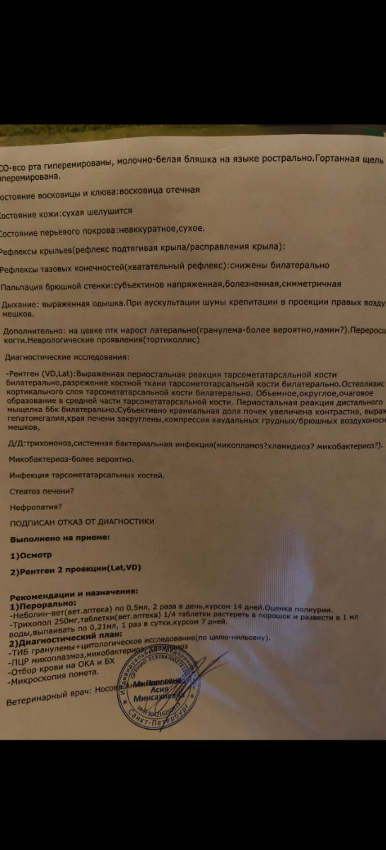 Спасибо за ответ! Сколько времени и чем 6 лет назад лечили микоплазмоз, сейчас уже не восстановить, знаю только что двумя антибиотиками одновременно, по назначению врача. И диагноз тогда был поставлен без анализов, на глаз, но после лечения симптомы прошли. С дикими контакт у голубки был постоянно. На рентгене видно как сильно разрушена кость ниже сустава. Пятно на шишке скорей всего натоптыш. На фото анализы, которые нужны здесь по предписанию врача, но которые сдать не можем (12 тыс!).