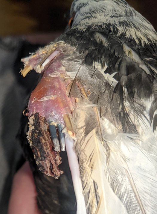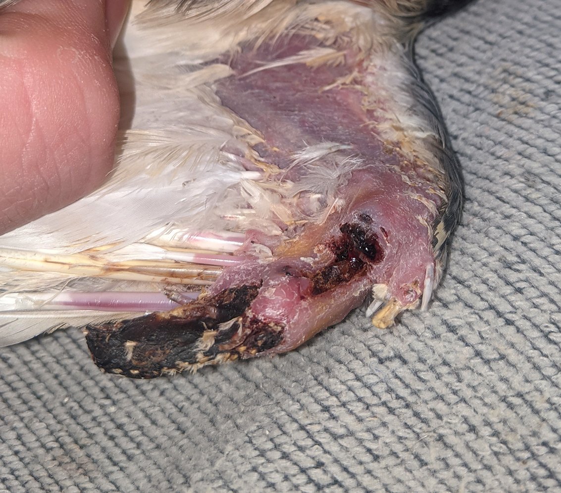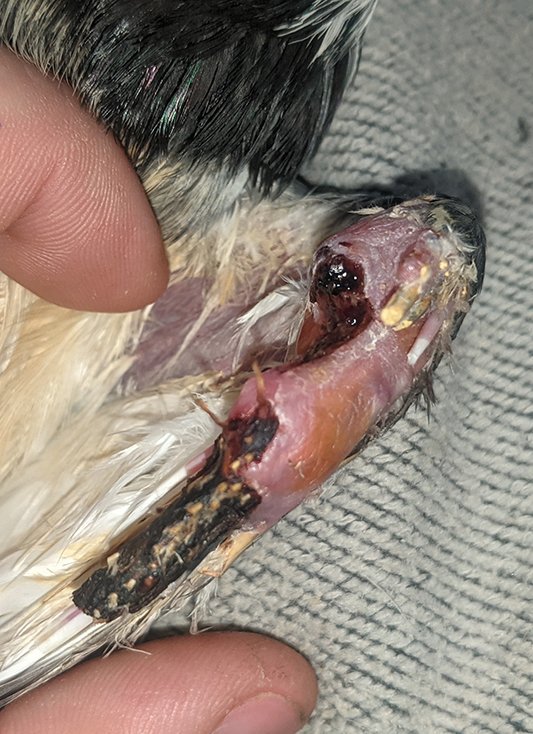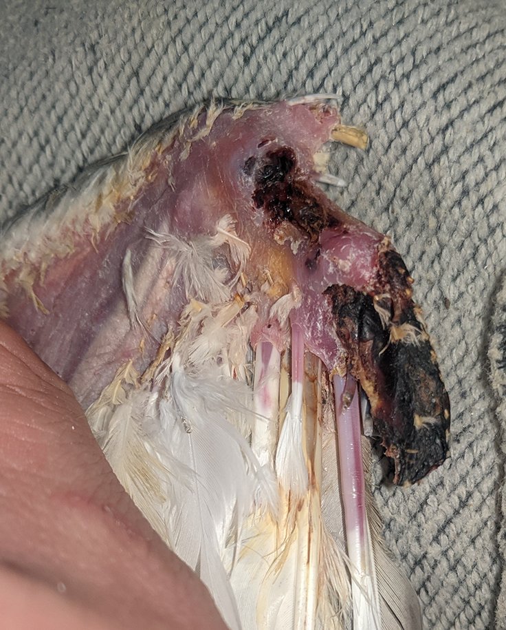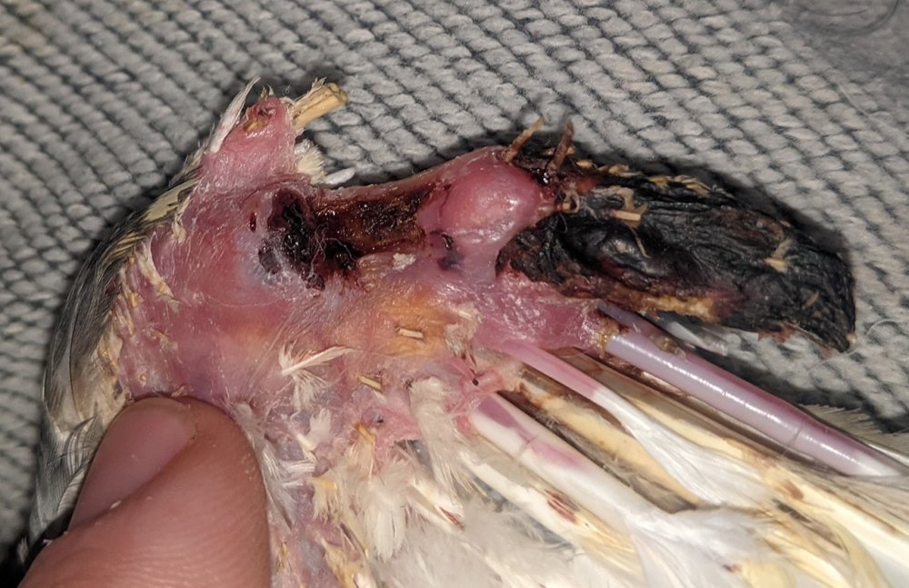 Так как он не даётся в руки, активно вырывается и из-за всех сил машет крыльями, шишка на плече отвалилась (на прошлых фото огромная такая была). Там выглядит менее страшно, но тоже глубокая рана, до кости почти что. С нижней части удалил перья из мертвой ткани, немного подрезал её, но по всей видимости отваливаться она пока не собирается. Растут новые перья. Показал всё на фото. Начал выпускать из коробки на прогулки, ходит по комнате, что-то клюёт, начал часто потягиваться. Из лекарств продолжаю антибиотик (уже месяц), и смесью промываю.