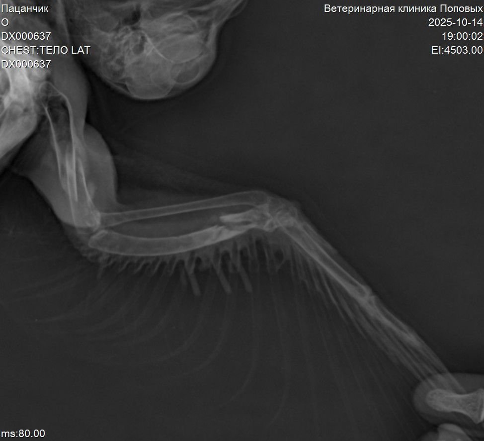 завтра утром сделаю фото, только убрал в коробку после манипуляций. Пока текущее фото. Один сплошной синяк, прямо жуть, наверное вряд-ли летать сможет, на пмж пропишу. Он когда от меня убегал, он в плече вверх задрать может, или когда дерётся поднимает крыло, а вторая часть, в локте которая, та висит.