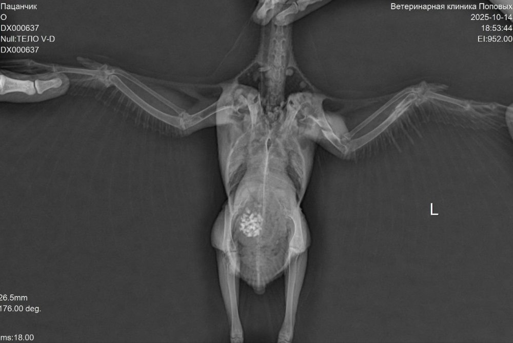 Вот последнее что было. Нового пока нет. Зерна после последней кормёжки чувствуются в зобе. Уколол второй укол глюкозы с физраствором спустя 8.5 часов. Перья чуть почистил и опять спит.