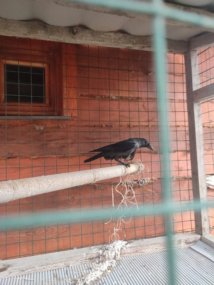 В конце осени 2025 года подобрали во дворе дома галку с поврежденным крылом. Я не врач, но судя по травме, она либо застряла где-то и оторвала часть крыла, пытаясь выбраться, либо кто-то вырвал ей часть крыла. Летать, вероятно, птица не будет. Она перезимовала у нас, а в апреле я перевезла ее на дачный участок в вольер. Птица, конечно, скучает. Времени заниматься птицей у меня нет. Да, и одна из наших собак, почему-то боится ее голоса, как только галка начинает издавать звуки, моя собака начинает дрожать, странная реакция, но тем не менее. В связи с чем, ищу птице добрые руки. Птица подвижная, любопытная, ест, пьет, любит водные процедуры, собак не боится, но нас, людей боится) Территориально г. Москва. Фото, далеко не лучшего качества, но я не могу ее нормально сфотографировать, так как при моем приближении она начинает волноваться и суетиться.