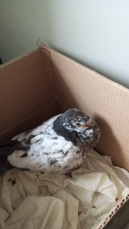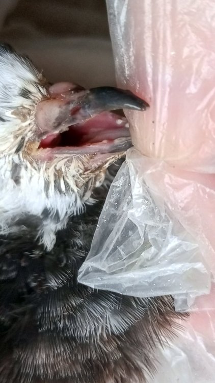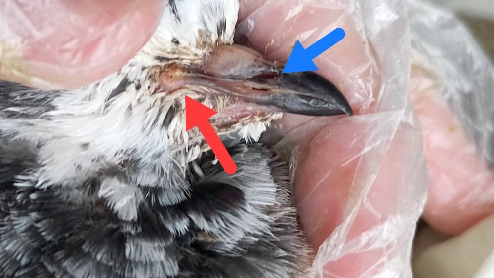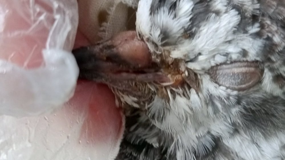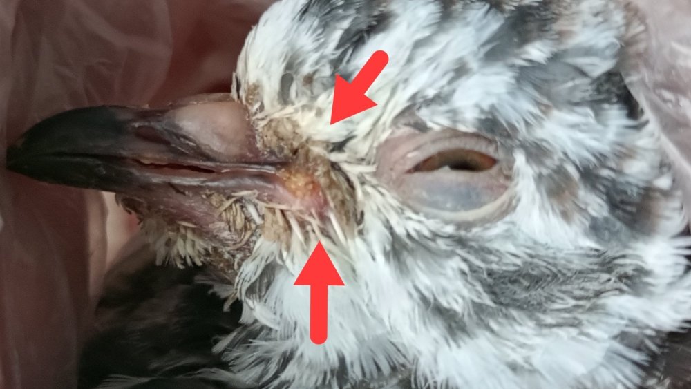 Здравствуйте уважаемые участники форума! Сегодня днем ко мне в форточку заползло(у меня вертикальные форточки до подоконника) вот такое чудо с балкона. Пищит, нахохленный, вялый, не ест, ещё хотя по-идее умеет, т.к. несколько дней назад я его видела с другими голубями. По осмотру: 1. Киль между истощением и худобой, если я правильно определила конечно. 2. В углу рта что-типа наростов или заед.(красные стрелки)Ни оспины ли? Сам клюв как бы с щербинкой(синяя стрелка) 3. Внутри клюва желтовато-белый налёт (как белые точки в клюве). Мне к сожалению не удалось нормально сфотографировать горло, но в глотке его прям много, и где дыхательная щель и щель в носовые пазухи тоже. Если потереть ватной палочкой то снимается, слизистая под ним немного кровит. Из носа пока осматривала выделялись прозрачные сопли, вокруг клюва следы не то гноя, не то засохших соплей, промакнула тряпочкой с мирамистином, под ними ран нет. Выделений из глаз при этом нет. Трихомонозных наростов я не обнаружила, но по бокам на горле под кожей есть твердые припухлости. Возможно все-таки трихомоноз или лимфоузлы? Посое осмотра птиц тяжело дышал с открытым клювом. Но кашля и хрипов я не слышу. Клоака была вся в желто-зеленом помете, на тряпке он сильно отдает жёлтым, почистила, под помётом оспин нет, клоака выглядит воспаленной. Покакал зелёным тоже. То ли от помета, то ли от самого птица неприятный запах. Общий вид птица. За 4 часа что он у меня, он не поел, как понимаю, надо уколоть ему глюкозу, срочно иду в аптеку за ней, заодно куплю нистатин. .1) Подскажите пожалуйста, какие лекарства ещё покупать? Это может быть только кандида или кандида всегда идет с инфекцией вместе? С чего начать лечение и как не добить птице печень? 2) Комната одна, у меня ещё есть мой голубь выпускник, который ест и отдыхает на подоконнике, также ему надо прокапать глаз, то есть птицы будут в одном помещении и я с обоими должна контактировать, как уберечь здорового от заражения? Может ли у новенького быть оспа и как тогда быть?