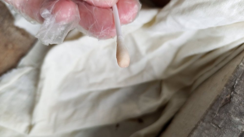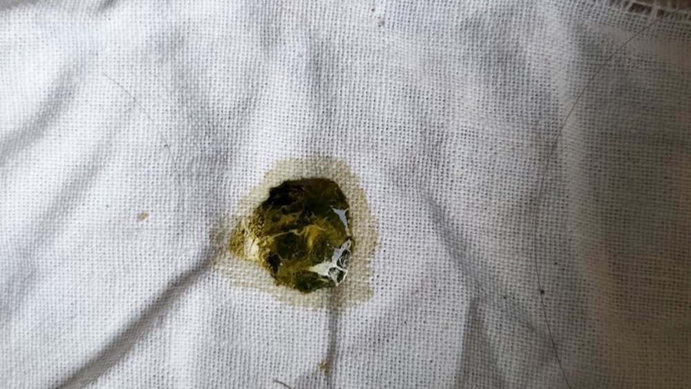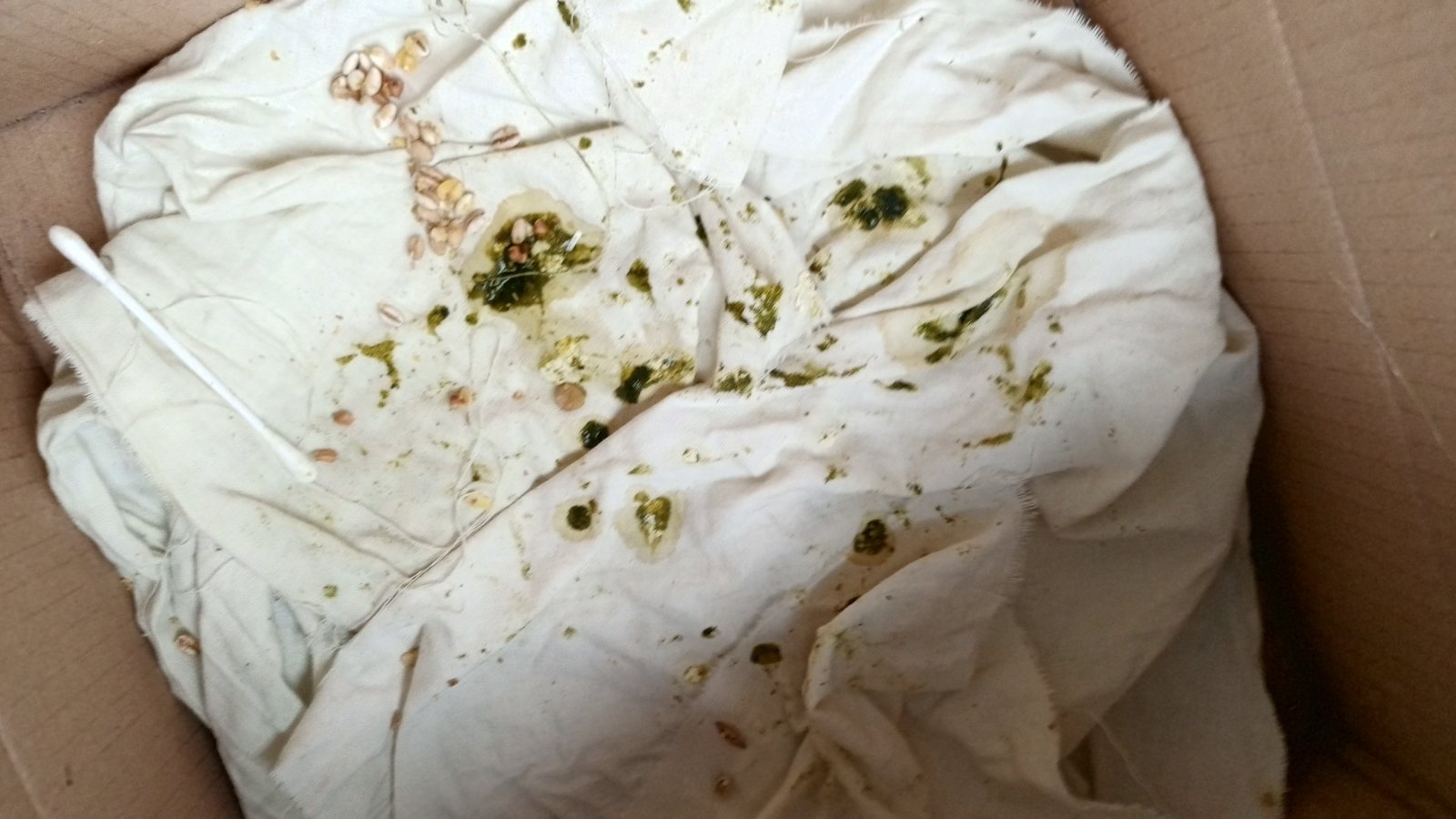 @маленький принц, добрый день! 1) Желтизна в помете пропала еще в день появления. Рвота больше не повторялась. 2) Вчера начали давать гепатовет птенцу и взрослому голубю. 3) Голубенок ест сам, но только маленькие зерна из корма рио. Остальные берет в клюв, щелкает и выбрасывает. Сильно не доедает. Мелких зерен за день вчера съел около 400 (я считал). 4) Помет, вроде, нормальный: 5) голубенок продолжает терять в весе. Сегодня около 250гр. Теряет около 5гр в день. В качестве эксперимента положил перед ним чищенных семечек - съел моментально. Другая еда такого энтузиазма у него не вызывает. Вопросы: 1) мы продолжаем ждать пока он начнет есть сам (у него в доступе корм рио для средних попугаев, булгур, колотый горох, гречка)? Дополнительно мотивируем видео и постукиванием пальца. 2) начиная с какого веса, кормить принудительно кашей (вес 250гр, возраст 65дней)?