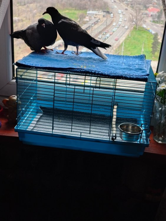 Добрый день, пока у меня. У нас очень холодная и дождливая погода стоит, жду потепления. Практически полностью оброс коротенькими пёрышками клюв. Пищать давно перестала, выдает что-то среднее между скрипом и кряканьем (я имею ввиду голос). Глазки стали светло коричневого цвета. Ворчун научил её бояться меня, поэтому когда я вытаскиваю её из клетки, она тоже ворчит и бегает от меня, чего раньше не было (по моим наблюдениям это классическое поведение голубок, в то время как голуби включают агрессию и начинают драться и клеваться). Пришлось перестать её кормить, чтобы начала есть сама. Не третьи сутки дело пошло, но с одним НО. Голубка ест самостоятельно ТОЛЬКО чечевицу. Выбирает её из остального зерна. Поэтому завтрак на её совести (столовая ложка чечевицы), а вторую столовую ложку зерносмеси я ей уже скармливаю сама вечером. Конечно на фоне большого количества чечевицы помёт светло зелёный и очень мягкий, но мне важно, чтобы она клевал и училась клевать. Во дворе ей уже придётся есть, что добудет, поэтому пусть развивает клевательный рефлекс хоть на чём-нибудь. С Ворчуном у неё очень нежные отношения. Каждое утро и вечер они вдвоем на подоконнике час-полтора, уже как получается у меня по времени. Она чистит ему перья, зачем-то лезет клювом в клюв, как будто он её родитель. Ворчун только пригибается и терпит, иногда укает. И пить нормально научилась тоже. Воду не разбрызгивает, пьёт аккуратно. Разве что может покакать туда... Но это у голубей дело обычное (( А по поводу попыток научить её клевать самостоятельно через видео с клюющими голубями и рассыпанными семечками, кунжутом и льном на белой бумаге... Всё мимо. Сработал инстинкт выживания. Хоть только и на третьи сутки.