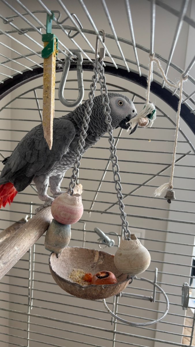 Здравствуйте! К нам переехал взрослый жако, так сложились обстоятельства, что мы согласились взять птицу себе. Прежние хозяева уехали, взять с собой жако у них не было возможности. Понимаем всю ответственность этого шага, надеемся что все у нас сложится хорошо. Изучаю сайт, но так как все произошло неожиданно и очень быстро, есть несколько срочных вопросов, буду очень благодарна за ответы и советы. 1) клетка на фото - его родная, поддон пока не чистила, чтобы не беспокоить лишний раз, сегодня планирую заняться уборкой. Вопрос по жердочкам - думаю заменить на новые, может размесить их поудобнее? И взять толстые ветки, яблоню, например. 2)игрушки - не обращает внимания на них, может заменить на новые, чтобы удивился и играл? 3)камень для клюва - как часто жако его грызет? камень старый, заменить? Или прикрепить сепию? 4)По словам бывшей семьи, ему лет 35-40, причем они уверены, что жако живут 90 лет. Почитав сайт, мы поняли, что в среднем 50. То есть это молодой дедушка? Выглядит наш новый сынок очень бодро, на фото видны лапки и клюв. Стоит ли его показывать врачу? 5)очень переживала по поводу переезда - к переноске не приучен, ехал в своей клетке, но не боялся, мяукал и свистел. Дома ведет себя как будто жил с нами всегда, хороший аппетит, пьет воду, берет из руки орешек, разговаривает и поет, танцует, просил купаться. Спит хорошо. На собаку в первый день громко скрипел и прогонял, но сегодня уже спокойно мимо себя пропустил. Я с волнением ожидала стресс и период адаптации, но этого ничего нет. Хочется спросить - это нормально? :))) 6) Клетку пока не открывали, сегодня только третий день как Пантелей с нами. Может попробовать открыть и пусть погуляет? Но как нам сказали, за палец может укусить, на плечо не садится (ну мы настаивать на этом не будем) В клетку раньше возвращался по команде, ему подставляли палочку и перемещали в клетку. Что делать, если этот способ у нас не сработает? 7) дача: если жако так спокойно перенес переезд, может попробовать приучить его к переноске или небольшой клетке и ездить с ним на дачу? Там есть возможность поставить ему огромную клетку или сделать вольер. На дачу ездим каждые выходные, на лето полностью переезжаем туда. Понятно, что летом всем составом туда переместимся, а как лучше поступать сейчас? Действительно ли поездки это стресс или все индивидуально? Статью про кормление попугаев внимательно изучаю. Наверное, некоторые вопросы выглядят наивными, но прошу отнестись с пониманием :)))