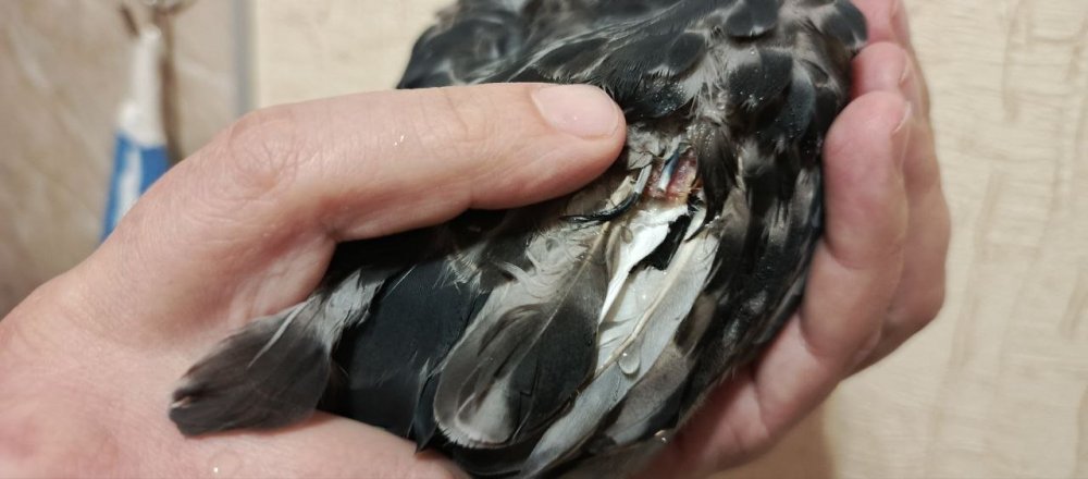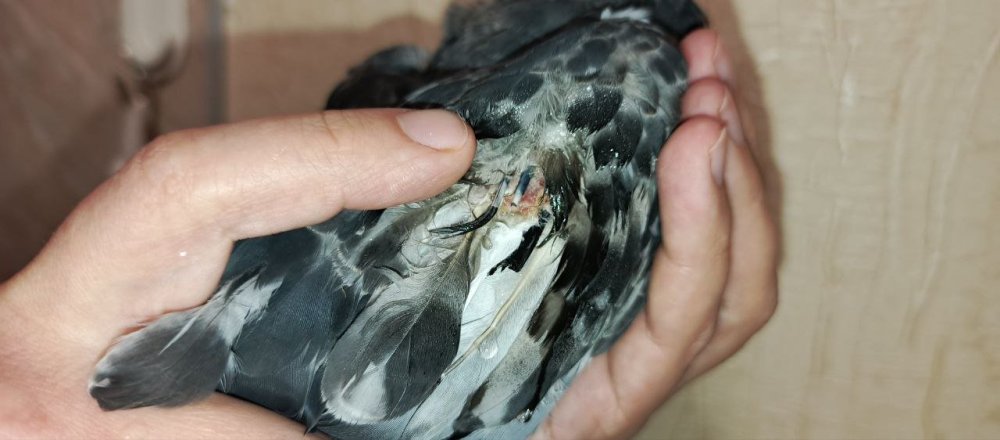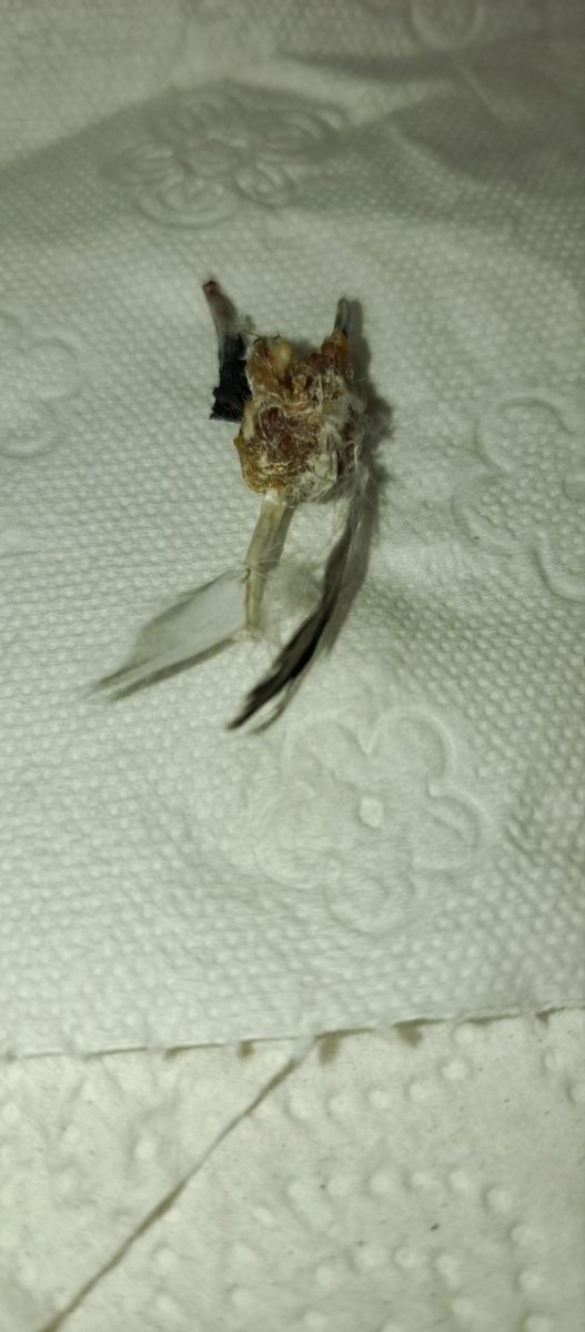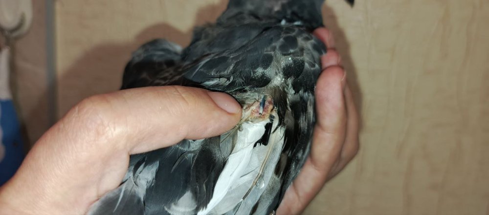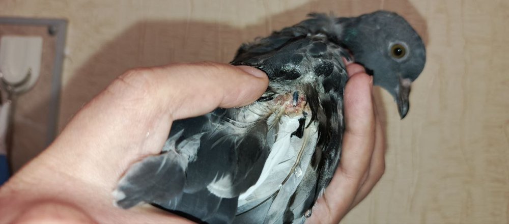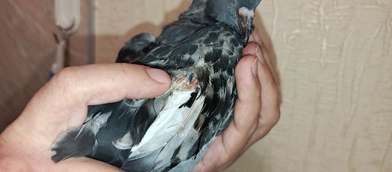 @маленький принц, добрый день! Голубенок взрослеет, уже начинает охранять территорию (крутится и кивает) иногда попискивает. Возраст 71 дня. Аппетит у голубенка слабый, начали кормить кашей два раза в день. Помет, вроде, нормальный. Желтого больше не было. Срыгивать перестал. Вес голубенка 260гр. Предполагаем откормить до 290-300гр (так думаем, что это самка) и снова предложить ему питаться самостоятельно. Сейчас даем ему пробиотик, карсил и гепатовет. Птица часто лежит как на фото. Периоды активности тоже бывают. Сегодня отвалилась большая "болячка" от крыла. Ранее мы встречали нечто подобное у другого уличного голубя. У него похожая "болячка" росла в течение нескольких месяцев на правой лопатке. Ее максимальный размер был около 2см в диаметре. Потом она начинала отрываться, держалась на тонком куске кожи, болталась при полете и в конечном итоге отрывалась. Это продолжалось из года в год. В общей сложности их было 3 или 4 на одном и том же месте. "Болячка" отвалилась сама, но к ней прилипла мягкая часть пера. В результата волоски пера вместе с капсулой/мешочком оторвались от цилиндра основания пера, в месте обрыва была кровь. Опрыскали хлоргексидином. Фото птенца:
