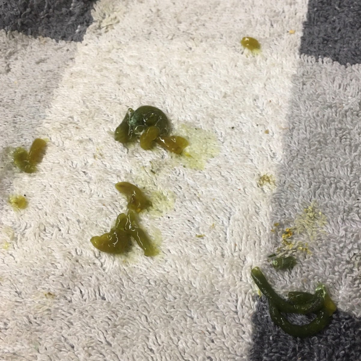 Спасибо большое! Утром вырвало его 2 раза. Всю запаренную пшеничную крупу вырвал, что я давала вчера.оказывается он точно свой пух проглотил. Тоже вырвало с едой. Помет не желтый, зеленый. Покормила детской безмолочной кашей