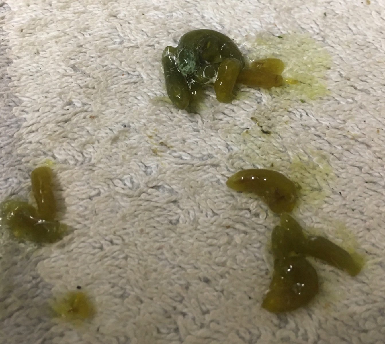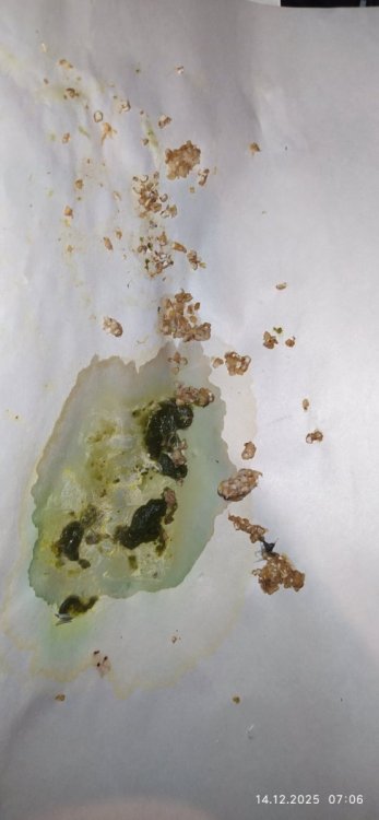 Прошло на тот момент 6 часов. Насколько полный был зоб точно сказать не могу, наверное процентов на 25-30. Помет такой Сейчас вернулся, зоб у птицы пустой. Сама не ест. Беспокоит то, что она стала издавать шмыгающие звуки. Из глаз и носа течёт как будто вода
