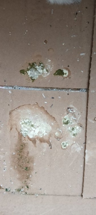 Ночью был в коробке на газете, помет растоптал, уверенно скажу только, что очень неприятный запах. На фото вчерашнее высохшее со дна коробки. Протерла ему клюв и восковицу ватой с хлоргексидином, корочки отошли, то что осталось на восковице и вокруг клюва сфоткала. Ещё вопрос, нужно и можно ли его сейчас купать?
