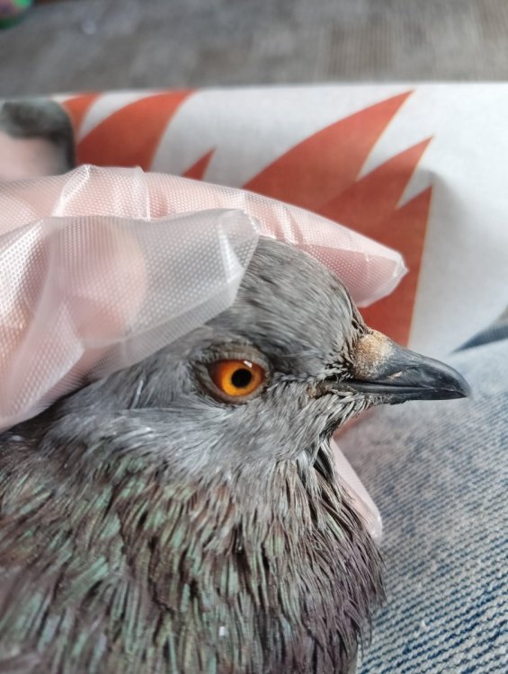 Рана на спине у голубя, половина спины ощипана( перьев нет) + больная лапка