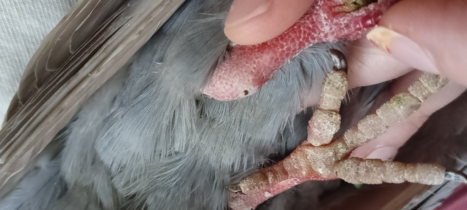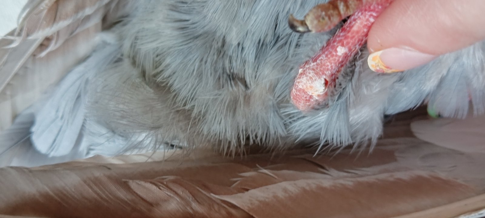 вот,то что около клюва. совсем близко не получается На правой лапке прошел отёк, но осталось уплотнение на передней стороне. Ходит хорошо, пальцы сжимаются но отбивается ей слабее, чем левой. Еще на лапках отшелушивается кожа (последнее фото) , может это быть связано с тем, что меня вчера дома не было, и он мало пил?