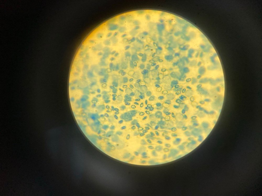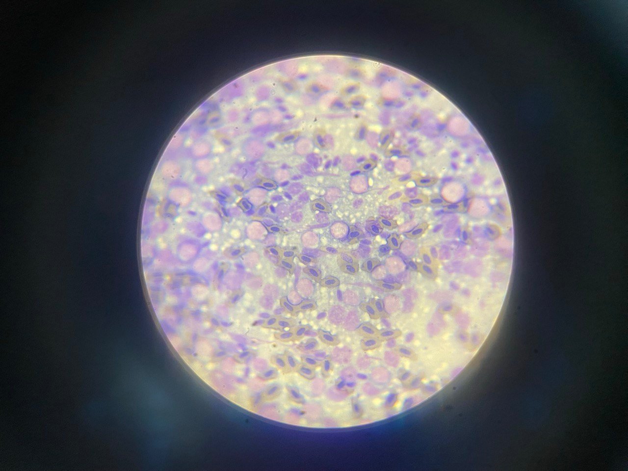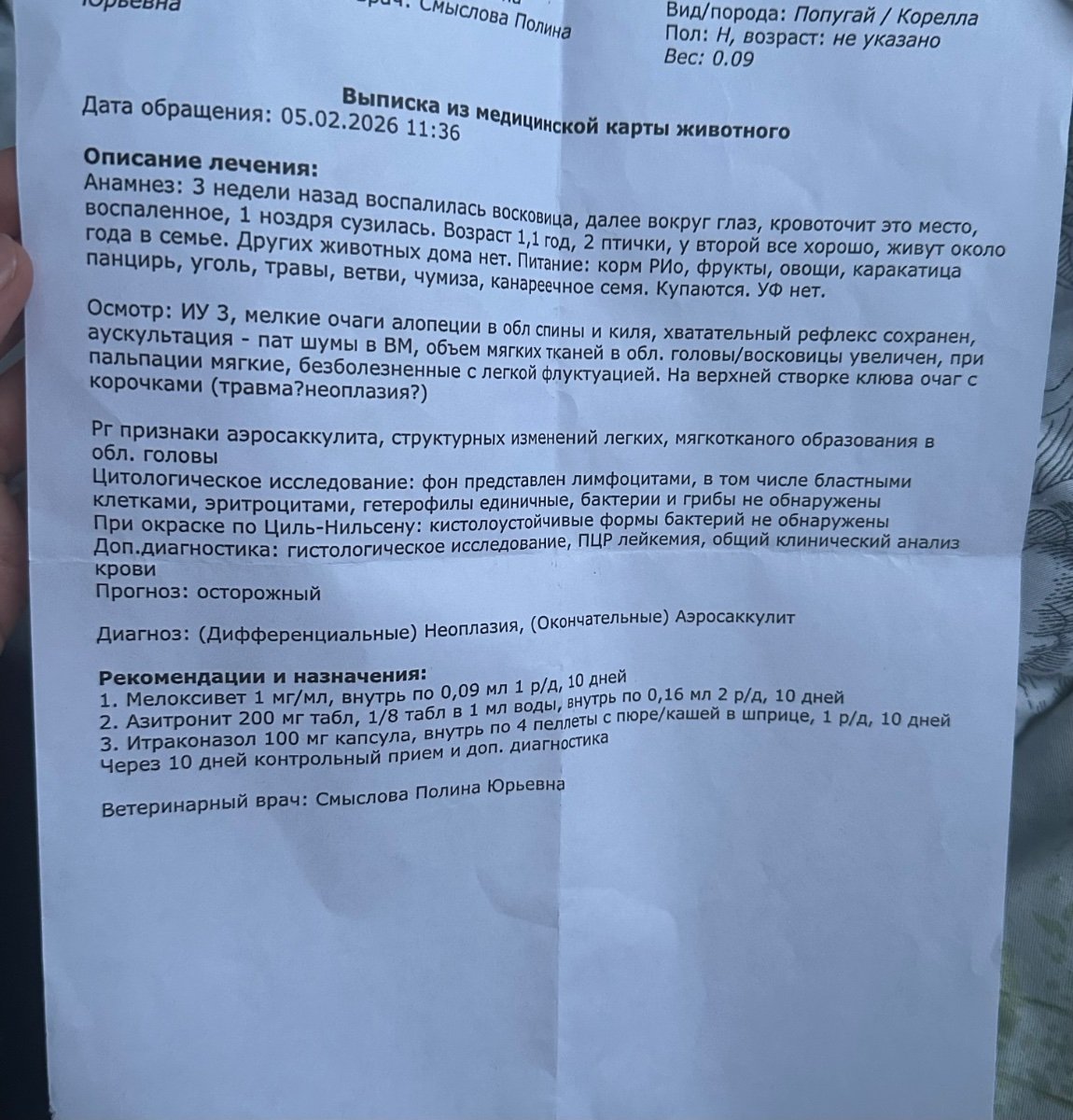 Добрый день, прошу помощи, потому что посещение орнитолога в нашем городе не дало нам разъяснения в ситуации. У попугая сначала воспалилась восковица, после этого область между восковицей и глазом начала воспаляться. Мы по рекомендации прокапали ципролетом и мазали воспаленную область гиоксизоном. На фоне этого появились улучшения: ноздря расширилась, воспаление с ноздри ушло, но воспаление с головы не ушло. Спустя 2 недели снова появилось воспаление ноздри, попугай стал часто чихать, слышно что тяжело стало дышать. Фото с состоянием воспаления приложила и подписала даты. Птица чешет место воспаления около основания клюва до крови. Вопрос, нужно ли нам надеть воротник, чтоб он не чесал это место? Сегодня были на приеме, врач взяла пробу с воспаления через шприц. Сделала гистологию и сказала о том, что нет микробов, непонятно почему идет воспаление. Кровь не брали. Гистологию также приложила. На приеме врач начала склоняться к онкообразованию. У птицы хороший аппетит, она активна, могу сказать , что активность снизилось на 10% примерно. Хотелось бы рекомендаций, хорошо ли подобраны подобраны препараты? Может кто сталкивался с такой ситуацией? Что можно сказать по снимку рентгена нашей птички? На фоне чего могут быть повреждены забиты воздушные мешки и легкие? добавлю, дома у нас 2 кореллы. У второй никаких признаков, состояние хорошее. Корм Рио, даем также фрукты и овощи, панцырь каракатицы, уголь. В копошилке всегда сено, высохшие ветки, щепа вишневая, чумиза, канареечное себя. Проросты не всегда даем, запариваем овес -