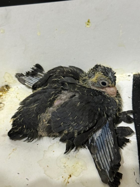Птенец голубя с опухшими лапами, с шишками на них и без хвоста и весь в мазуте!