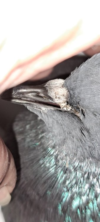 То что отпало он проглотил. А место под клювом справа где нарост первый был, но тот был большущий. Зеленкой намазано, тут была еще выпуклость. Первый отпал, а эта шишка оставалась. Видимо недолеченный трихомоноз прятался. И из этого места снова пророс нарост но меньше. Теперь этой выпуклости нет. Всё пропало.