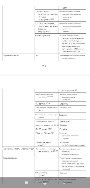 2. Первое. Купите пжлст кухонные весы, можно самые недорогие по акции. Лечение голубей (а голубь этот не первый, насколько я поняла, и думаю не последний) с определением веса, соответственно дозировок на глаз не есть хорошо. Отталкиваемся от приблизительного веса, 220-240 гр. Таблетка у Вас была, я так поняла, 1000 мг фенбендазола, 100 мг празиквантела. 0,6 мл при вашем разведении это 0,6*125/5 = 15 мг фенбендазола 0,6*12, 5/5 = 1,5 мг празиквантела Или в пересчёте на кг веса 15/0, 22-0,24 = 68 - 62,5 мг/кг фенбендазола празиквантела 6,8 - 6,3 мг/кг Согласно Карпентера дозировка фенбендазола при капилляриях для голубей 20-50 мг/кг * 5 дней (без повтора) празиквантела 10-20 мг/кг Получается превышение максимальной дозировки (50 мг/кг) по фенбендазолу в 1,25 раз (на вес 240 гр), а на меньший вес и того больше. При том, что он, согласно того же карпентера, токсичен для голубей. Поэтому поддержу МАККА насчёт детоксикации Капиллярии (род Capillaria) — это тонкие нитевидные нематоды (круглые черви), которые вызывают гельминтоз — капилляриоз, поражающий преимущественно тонкий кишечник, но также возможны поражения легких и печени. Если у голубя действительно капиллярии и в лёгких или печени, то пирантел не подходит, т. к. действует только на кишечные нематоды. Празиквантел против других паразитов.