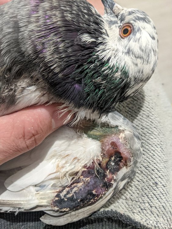 Здравствуйте уважаемые участники форума! Сегодня днем ко мне в форточку заползло(у меня вертикальные форточки до подоконника) вот такое чудо с балкона. Пищит, нахохленный, вялый, не ест, ещё хотя по-идее умеет, т.к. несколько дней назад я его видела с другими голубями. По осмотру: 1. Киль между истощением и худобой, если я правильно определила конечно. 2. В углу рта что-типа наростов или заед.(красные стрелки)Ни оспины ли? Сам клюв как бы с щербинкой(синяя стрелка) 3. Внутри клюва желтовато-белый налёт (как белые точки в клюве). Мне к сожалению не удалось нормально сфотографировать горло, но в глотке его прям много, и где дыхательная щель и щель в носовые пазухи тоже. Если потереть ватной палочкой то снимается, слизистая под ним немного кровит. Из носа пока осматривала выделялись прозрачные сопли, вокруг клюва следы не то гноя, не то засохших соплей, промакнула тряпочкой с мирамистином, под ними ран нет. Выделений из глаз при этом нет. Трихомонозных наростов я не обнаружила, но по бокам на горле под кожей есть твердые припухлости. Возможно все-таки трихомоноз или лимфоузлы? Посое осмотра птиц тяжело дышал с открытым клювом. Но кашля и хрипов я не слышу. Клоака была вся в желто-зеленом помете, на тряпке он сильно отдает жёлтым, почистила, под помётом оспин нет, клоака выглядит воспаленной. Покакал зелёным тоже. То ли от помета, то ли от самого птица неприятный запах. Общий вид птица. За 4 часа что он у меня, он не поел, как понимаю, надо уколоть ему глюкозу, срочно иду в аптеку за ней, заодно куплю нистатин. .1) Подскажите пожалуйста, какие лекарства ещё покупать? Это может быть только кандида или кандида всегда идет с инфекцией вместе? С чего начать лечение и как не добить птице печень? 2) Комната одна, у меня ещё есть мой голубь выпускник, который ест и отдыхает на подоконнике, также ему надо прокапать глаз, то есть птицы будут в одном помещении и я с обоими должна контактировать, как уберечь здорового от заражения? Может ли у новенького быть оспа и как тогда быть? Обновлено: птиц приободрился, летает, но дышит со свистом. Тухлый запах идет от помета.