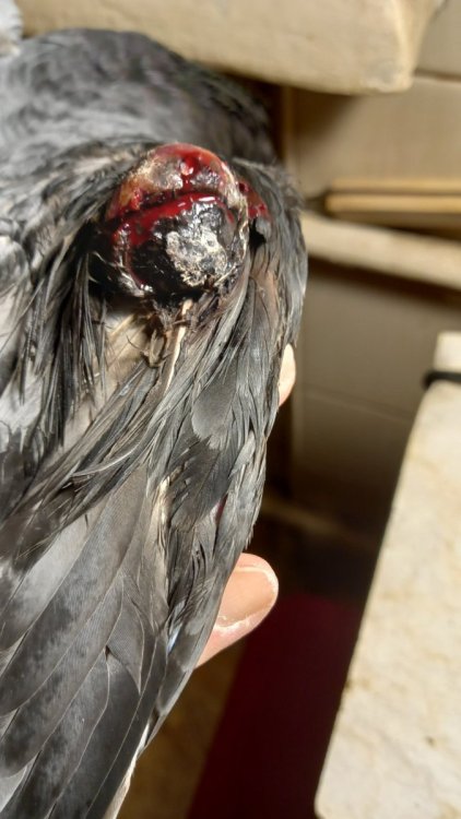 Доброго дня, впервые столкнулись с такой проблемой: у вертячника, которого мы лечим от вертячки, вздулась большая кровоточащая шишка. Скорее всего от того что он регулярно закручивает головку и клюет себя в это место. Мы случайно заметили (за пышными перышками было не очевидно), к тому же иногда нападали на следы ярко-алой крови на полу и не могли понять от которого гули это может быть. Шишка плотная, но мягкая. Сначала несколько дней накладывали левомеколь, но шишка продолжает оставаться в размерах, присутствует какая-то чернота с белым налетом в том числе и кровоточит. Сегодня решили попробовать мазь Вишневского. Посоветуйте пожалуйста что делать в такой ситуации.
