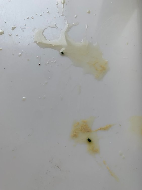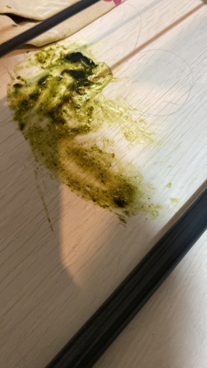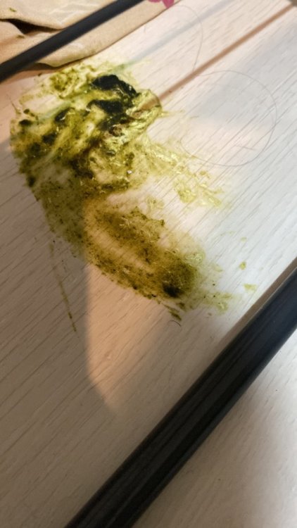 Наш мешочек почти весь рассосался! Уколола глюкозы по 2мл под каждую лапу. Утреннюю кашу не вырвал. Птиц сегодня совсем грустный. Только сидит и дремет. Не летает совсем… Вот так выглядит «помет» Выбросил-обломал перо. Пока кормлю тем, что есть. Хожу по магазинам ищу кашу. Но пока все с добавками.