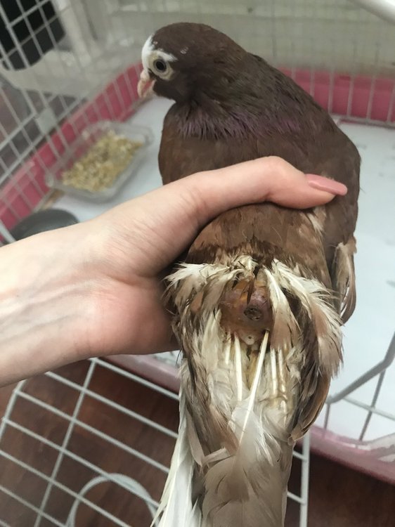 Нашли на улице голубя,вернее наблюдали за ним неделю и подкармливали,он не летает а просто ходит.Все перья у него слипшиеся,кушает хорошо,помет темный ,но не жидкий.В связи с наступлением морозов на улице было решено его взять на балкон пока не окрепнет.Кормим смесью для попугаев крупных пород ,ест очень хорошо.Сегодня решили его искупать шампунью для котов против паразитов,не помогло.Перья все слипшиеся остались,но было обнаружено при мытье,что у голубя ровно с двух сторон хвоста одинаковые красные большие шишки.Соплей нет,дыхание ровное,на крыльях залысины ,возможно даже ранки.Он не чешется,но много залысин по телу.Не летает,вспахивает на полочки на балконе.В квартире есть ещё попугай,боимся заразить случайно питомца,но они сидят в разных помещениях.Наррстов на лапах и клюве нет,внутри клюва все чисто ,без налета.Координация хорошая у голубя,но после купания долго приходил в себя,посадили на батарею,отошёл.Что за шишки могут быть у хвоста и что делать с перьями подскажите?- 33 ответа