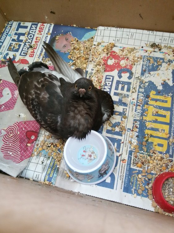 Два дня назад младшая подобрала голубя с вертячкой. Перья обработали пудрой чистотела два раза (один вчера и один сегодня), т.к были пероеды, голову птицы закрывали, чтобы в глаза не попало. Горло чистое, соплей нет, киль в норме, повреждений наружных нет. Начинает сильно вертеть головой, когда волнуется. Вчера утром дали пирацетам, а вечером глицин. Антибиотик не даём, хоть и пишут на сайтах, что при верятчке его дают. Сегодня купим Тиамин. Кормим принудительно, потому что сам он ест не очень. Перловка+горох (гороха немного). Сегодня купим просо в зоомагазине. Вчера в помёте было много воды, думаю, потому что много пил. Голубя держать дома не можем, папа не разрешает, поэтому живёт в коробке в подъезде на нашем этаже. В коробку стелим газету и тряпку, чтобы теплее и мягче было, меняем раз в день утром. Возможности сдать анализы нет, потому что нет таких клиник, куда голубей принимают в нашем городе( Чем ещё можно лечить? Какие примерно сроки? Что убрать, а что добавить из лекарств? (На фото ночной помёт) (Форум почему-то не даёт загрузить видео)