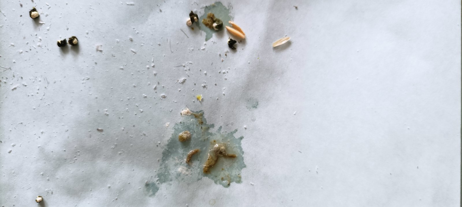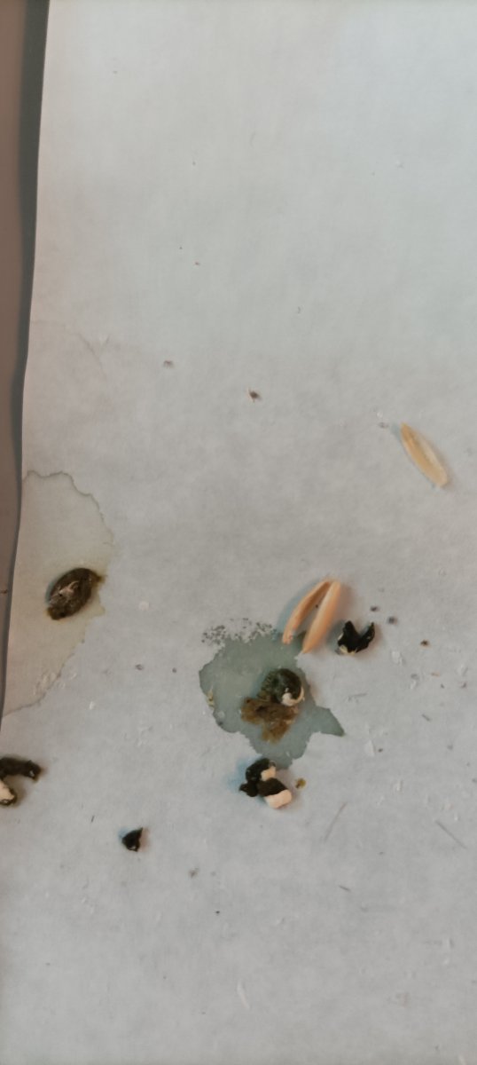 Здравствуйте! 2. Волнистый попугайчик 3. Мальчик, 2,5 года 4. Prestige budgies, морковка, яблоко, гречка 5. t 25C, влажность низкая сейчас из-за батарей 6. Световой день длинный с 9 утра до 12 ночи в данный момент 7. Раньше был крайне активный, здоровый, доставучий, до всех домагался, ничем не болел. Сейчас стал по спокойнее. Пару месяцев назад появилась небольшая отдышка, метеозависимость( в плохую погоду может прилечь на живот), иногда появляются щелчки при дыхании. Также заметили, что у него изменились пропорции, небольшая округлость внизу как небольшое пузико, он расчесал это место до лысины. Сейчас вроде бы не так сильно это бросается в глаза, да и он перестал его нервно чесать. Но главная проблема сейчас в другом. 10 дней назад у него стул резко стал бледного цвета, изменился в обьеме в большую сторону - предположительно после того, как он стащил кусок жирной еды(яичница с мягким сыром с маленьким сроком годности). Я вычитала, что это мог быть панкреатит, а также что в таком случае нужно давать попугаю каши и мезим. Соответственно давала ему много гречки и немного мезима туда. Стул иногда по утрам становится нормальным по цвету и консистенции, а потом в течении дня портится и даже иногда становится полностью жидким. Не понимаю, как исправить его какули.. с ними никогда раньше не было проблем. 8.1 ничего не проводилось, орнитолога в городе нет 8.2 мезим несколько дней - улучшения от него не особо заметно энтерофурил пару дней из-за жидкого стула - он его нанавидит, как видит шприц улетает на другой конец комнаты, клюв не открывает, очень его боится хофитол - собираюсь начать давать сегодня 8.3 как и писала ранее, есть улучшение кала периодические(чаще утром), но будто с моим лечением не связанные 1 фото - нормальные обычные какули до отправления 2 фото - первый день отпраления 3 фото - через неделю после отравления 4 фото - сегодня 5 фото - был легкий запор с утра, вышла странная единичная темная какуля