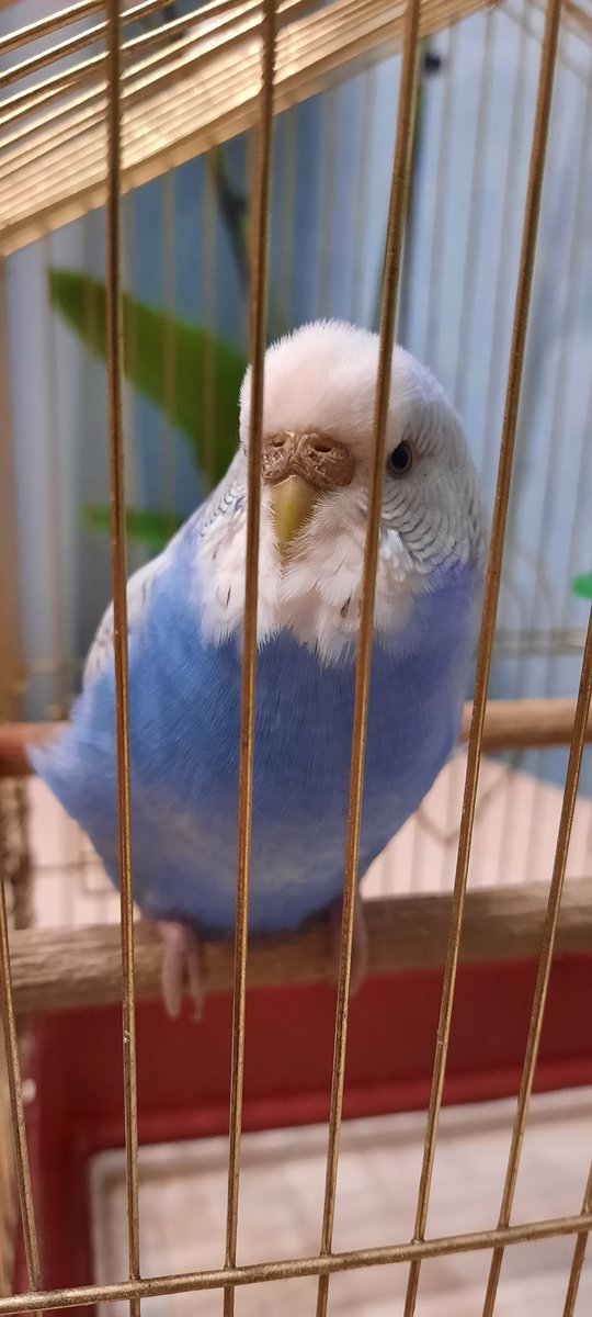 Всем добрый день! Помогите пожалуйста, мой волнистый попугай, девочка, 9 лет, были проблемы с кишечником, прописали с 12 августа на месяц пить два лекарства, Ветом4 (от расстройства, дисплазии) в поилку и Unitab витамины в кормушку. Мы узнали, что у нашего попугая недовес, была 28 г, по совету ветеринара из другого города прокормили детской кашей на воде до 34 г за 11 дней, кормим до сих пор, птичка подсела на кашку, очень нравится, какает жидко, на фото левая восковится шелушится и порозовела, выглядит сухо, клювик шелушится, из-за сломанного крыла не летает 6 лет, но бегает довольно активно, людскую еду не ест, раньше подъедала со стола, уже как месяц ест только свой корм и кашку детскую, бывают лапки холодные, бывает сидит нахохлившись прижавшись к моему телу. Раньше из-за длинных когтей подгибала большой передний палец, когти в ветеринарной клинике обстригли, но по привычке подгибает до сих пор. Когда закрыта в клетке сидит внизу, чаще всего по углам. Помогите пожалуйста, так как в Иркутске нету орнитологов( -