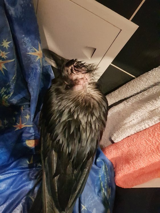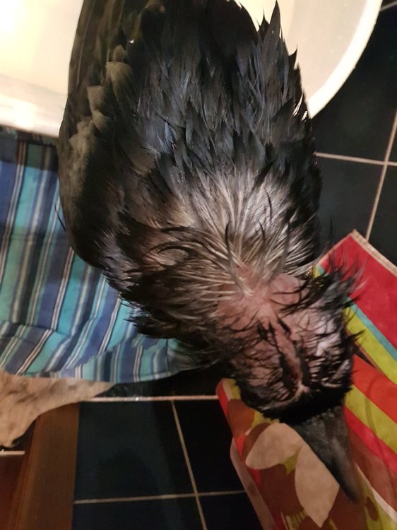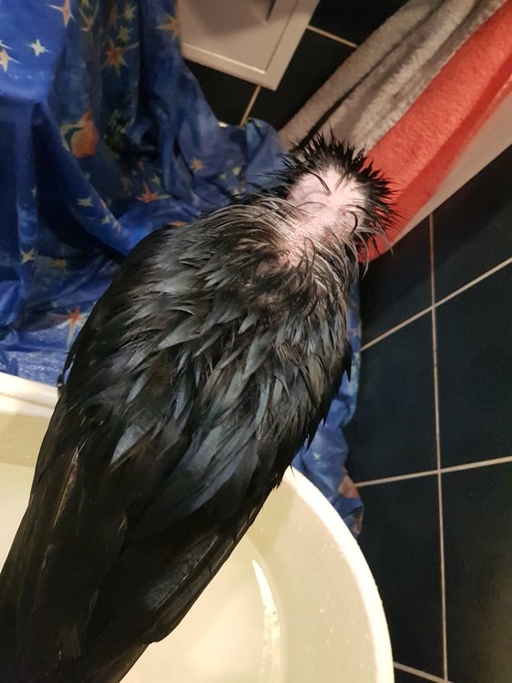 Обнаружил островки лысины у нашего ворона на шее, голове и зобе. Пеньков, которые обычно бывают при линьке, там нет. Обратил внимание, что птица периодически чешется (как бы сериями, почешется какое-то время, потом некоторое время не чешется). Я почесывания списывал на линьку, да мы линяем сейчас, но лысин раньше при линьке не было. Более крупные перья вроде линяют (меняются) нормально. Как наполнитель в клетке используем стружки, в какой-то момент мне показалось, что, после использования стружек другой марки (не тех, что брали обычно) птиц и начал чесаться. Но уверенности в этом нет. Как давно это произошло - тоже не вспомню, но, может поможет понять в чем проблема. Возраст: 16 лет Пол: вероятно мальчик Содержится в квартире, в клетке, иногда выпускаем побродить по квартире, организуем купание. Рацион - до 24 марта, когда я написал сюда это сообщение, мы кормили Роню прямо совсем неправильно. После 24 марта стараемся кормить "как надо": Мешанка из гречки (заварена в воде) или пшена (сварено) с тертой морковью, тертым яблоком, семечками тыквы, изюмом + к этому разные фрукты кусками (груша, яблоко, виноград) - раза 3 в день Яйцо перепелиное 1 раз в день Мясо сырое или курица вареная (вываренная 2 раза) - 1 раз в день Творог 0% 1 раз в день Иногда сверчки (если удается купить) Раз в неделю - мышь, мед Также каждый день в еду спирулина/ламинария, сера (засек 2 недели, добавляю, линька же), 1 толченую таблетку карсила, голубая глина. Регулярно фундук (кедровые или грецкие орехи изредка) Заметил, что фундук не очень переваривается - выходит кусочками с "тошнилками", непонятно, стоит ли его давать в этом случае или просто много даем. Как помочь, возможно ли регенерировать перья? На фото птица мокрая, после помывки.