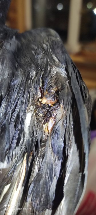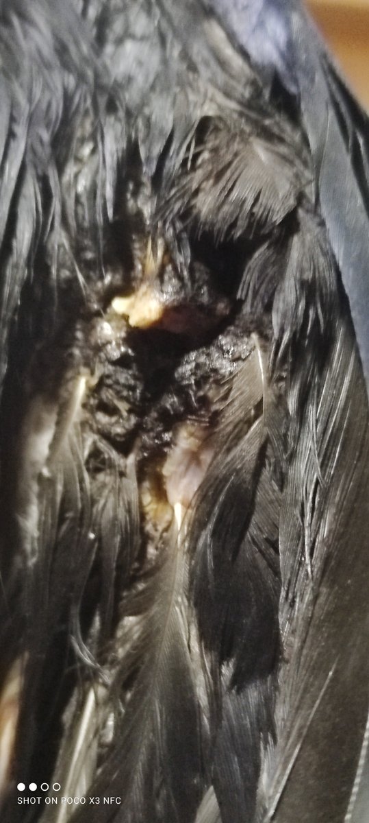 Сегодня мне удалось поймать ворона или грача с перебитым крылом, принёс его домой обработал крыло перекисью и хлоргиксидином, напоил и посадил в коробку. На крыле открытый перелом, судя по всему в суставе, перелом не очень старый ибо кровь хоть и запекшаяся но выглядит свежей, гнилью от крыла не пахнет. Ведёт себя он нормально, не нервничает и вялым не выглядит. Сделал несколько фотографий крыла, подскажите что делать и выживет ли птица вообще