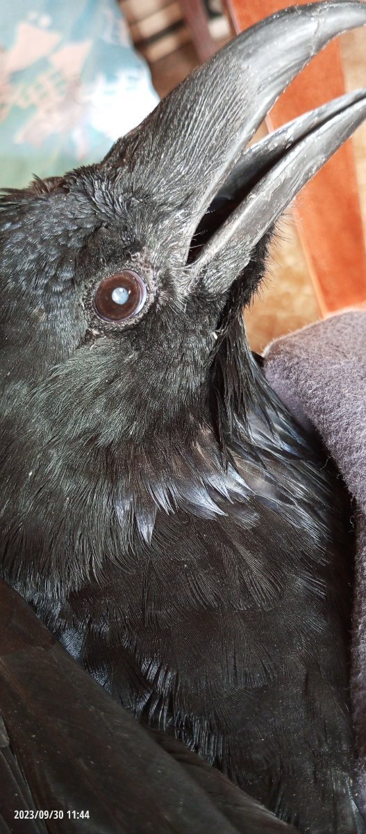 Здравствуйте, буду рада любому дельному совету. Проблемных симптомов несколько. Так сложились обстоятельства, что этим летом вОрон получал в основном еду и чистку ,, местожительства,,, а вникать в состояние здоровья было некогда. Птица отбили у вороньей стаи. В результате: нелетный, на голове вмятина, лапка/пальчики нерабочая. Пол, возраст неизвестен, у меня живет около 10 лет сначала на кухне, затем в комнате рядом с подоконником, в т.ч. и на нем. Окна на юг, поэтому всегда сухость повышенная, особенно при включении отопления. Ночью шторы закрыты до 10 утра. Еда в основном сырые: куриные сердечки и шеи, иногда желток, свиная нарезка, иногда суп, каши, сыр. В первый год у меня - два месяца жидкие витамины и все больше витамины не давала. Активный, бегал копался в своем жилище и спрыгивал на пол и носился туда сюда. А этими весной- летом только у себя шуровал. Но мне некогда было, да и легче - не нужно тереть кучу какулек после его беганья по комнате/ коридору. В течение этих лет среди ночи были единичные случаи, когда он начинал как то биться, запрокидывая голову. И терялся в пространстве, как будто не видел ничего. Помогали разговор и прикосновение. Ворон как был очухивался и дальше месяцами все норм. Чаще всего предшествовало этому, например, соседи громко орали или какое-то другое напряжение. Этим летом среди ночи падает с жердочки и кружится немного запрокинув голову набок, пару раз лежал на боку не мог встать, бил крылом и каркал. Когда идёт по коридору пугается теней и приседает, все время смотрит наверх, поворачивая голову. Сейчас понимаю, что он вероятно не видит и только под таким углом зрения рассматривает окружающие предметы. 😖Так как он днём практически всегда на солнце, то не сразу поняла, что беленькие кружки в центре зрачка - это нехорошо...😒 На данный момент кроме непонятной "неврологии" больше беспокоит потеря зрения, как сейчас понимаю очень и очень существенная. Фото глазиков прилагаю. В правом белое больше. Никаких воспалений, травм точно не было. Потеря зрения от старой травмы головы, от ,,неврологии,, или недостаток витаминов (сейчас прочитала много постов на форуме и 😭🙈кормление было неправильное)??? Можно ли вернуть или хотя бы оставить на этом уровне зрение? 🙏🙏🙏- 8 ответов