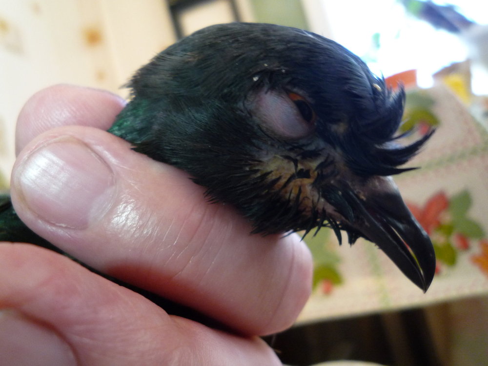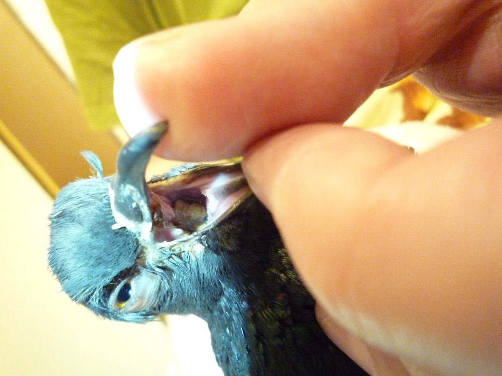 6. Добрый день! Неделю назад, вечером 15 июля, нашли больного голубя. Истощен, лечу от трихомоноза. Воспален глаз, с этой же стороны (справа) есть желтизна на коже. Есть выделения из носа. Лечение провожу препаратами, указанными тут http://sizariki.narod.ru/diseases/invasion/trichomoniasis.html . Амоксиклав (250+125, 1 таб. на 5 мл., 0.5 мл. в клюв) 2 раза в день перед едой; Орнидазол (500мг, 1/4 таб. на 5 мл., 0.3 мл в клюв) 2 раза в день перед едой; Пимафуцин (Натамицин) (100мг, 1/4 таб. на 5 мл., 0.5 мл в клюв) 2 раза в день примерно за час до еды; Карсил (1/2 таб. прямо в еду или после); Люголем мажу наросты в клюве, и начал мазать желтую кожу. Кроме того, глазные капли Ципромед несколько раз в день. Тут же стараемся размочить и открыть глаз. Когда его только нашли, голубь был очень слаб, один глаз опухший, закрыт, покрыт корочкой. Желтизна на коже головы справа вроде уже была. Клюв полностью не закрывается. На носу видимо засохшая слизь была. В горле имеются желтые наросты, запах вроде был. На ощупь крайнее истощение (20 июля взвесил, после 9 г. проса и питья весил 223 г.), голову не мог держать, клонил вниз. Сейчас после лечения наросты вроде бы частично начинают темнеть, клюв так же не закрывается полностью, мешает нарост, но он заметно потемнел уже. Опухоль глаза уменьшилась, но глаз все равно закрывается, хотя раскрывать его уже проще, и дольше остается полуоткрытым. Сил заметно прибавилось, держит голову, уже по чуть чуть ест сам просо, чистится, чешется, при лечении активно сопротивляется, выпрыгивает из рук и планирует на пол. Если его не трогать, в основном стоит, сильно не убегает, и вроде особо не боится. Но меня сильно беспокоит, что на половине головы, где воспален глаз, кожа желтоватая. Он там под клювом часто усиленно чешет. В начале как то не сильно придавал значение этому образованию... А сейчас уже сильно волнуюсь. В Последние дни стал там люголем мазать, купил бетадин, может им попробовать? Или что то еще... В ту ночь, когда его только принесли, глаз размочили водой, капали Ципромед. Скормили жиденькой пшенной каши из шприца с трубочкой, по чуть чуть в клюв заливали, и он сам глотал. Дали Амоксиклав и Орнидазол. Четыре дня кормили из шприца перемолотым и заваренным кормом для попугаев с убранным овсом, подсолнечником, сафлором и добавленными витаминами для птиц. Туда добавлял и карсил. Было около 16 мл. смеси за раз, чайная ложка около 7 г. порошка. 2 раза в день. Стул был с жидкостью, было зеленоватое. На пятый день смог потихоньку сам есть просо из попугайного корма, другие мелкие зерна если и ест, то очень плохо. Крупнее зерно, перловку, пшеницу - пытается клевать, но безуспешно. Какашки стали похожи на здоровые, оформленные. Уже два дня съедает около 20 г. зерна за день. Зерно уходит очень медленно, плохо получается. Т.к опыта у меня нет, я не уверен в эффективности лечения, возможно нужно что то скорректировать. Вот эта вот желтизна, что это? Трихомоноз, или что то еще?