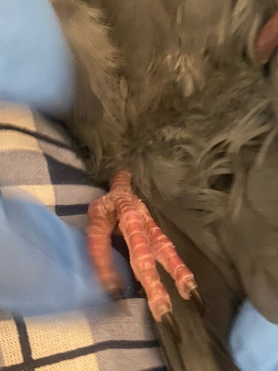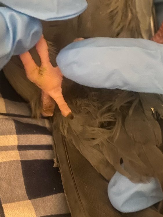 Очень быстро начну тему, только-только подобрал гулю. Дышит с сопением, пушится чем осталось: перья буквально от касания опадают. Тощий ужасающе. На лапке что-то типа волокон от влажной салфетки, сейчас уберу. Фото пока такие. Паразитов никаких на перьях нет, выпадают целыми. Глаза чистые, рот бледный и немного сопливый. Сейчас покормлю жидкой кашей с перловкой и гречкой. Помёт жду, но зад мокрый, вряд ли дождусь. Что за дело с ним и какую информацию докинуть? Паникую. Помёт. Хотя бы есть....